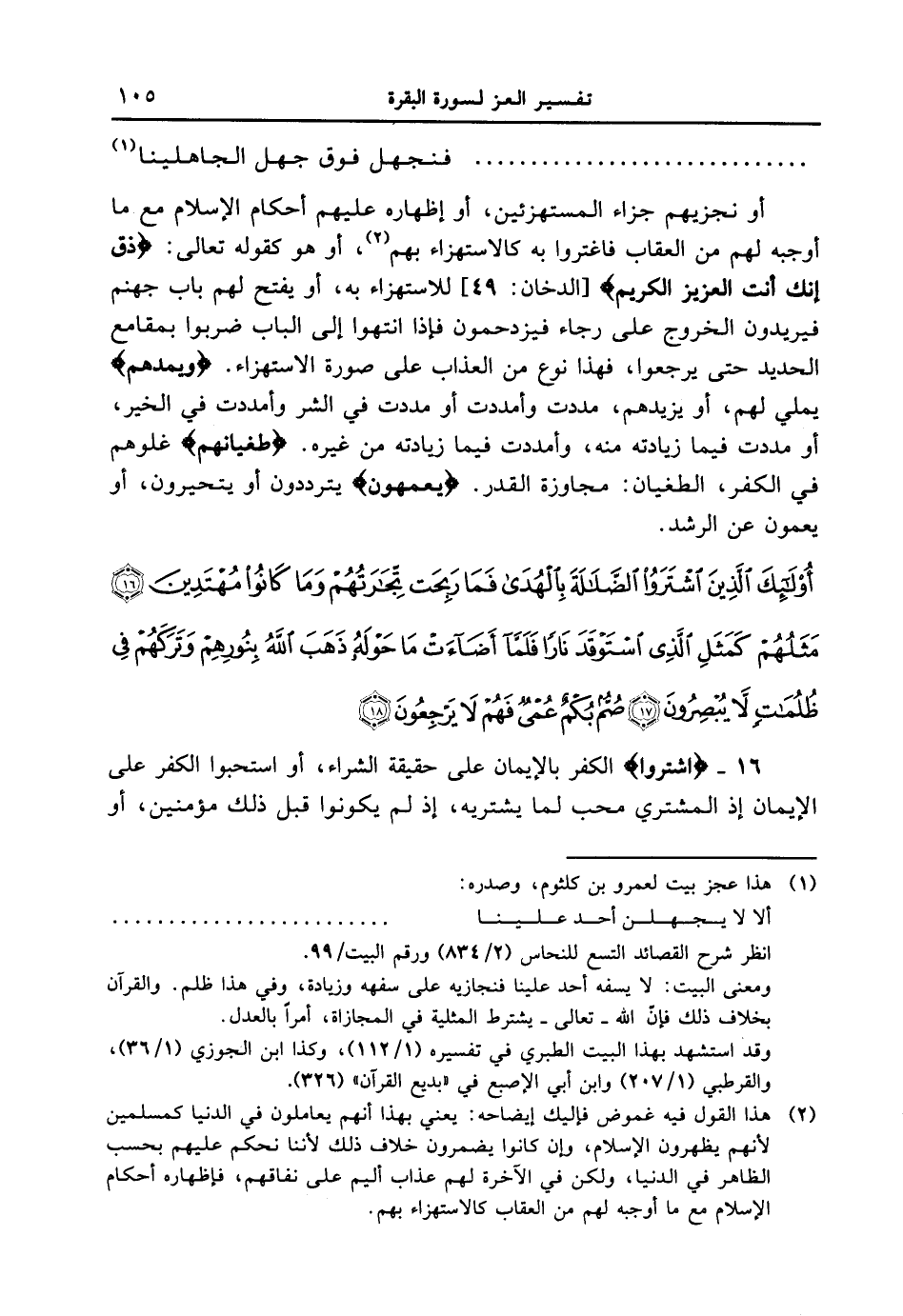 أو نجزيهم جزاء المستهزئين، أو إظهاره عليهم أحكام الإسلام مع ما أوجبه لهم من العقاب فاغتروا به كالأستهزاء بهم، أو هو كقوله تعالى: {ذُقْ إِنَّكَ أَنتَ العزيز الكريم} [الدخان: 49] للاستهزاء به، أو يُفتح لهم باب جهنم فيريدون الخروج على رجاء فيزدحمون فإذا انتهوا إلى الباب ضُربوا بمقامع الحديد حتى يرجعوا، فهذا نوع من العذاب على صورة الاستهزاء. {وَيَمُدُّهُمْ} يملي لهم، أو يزيدهم، مددت وأمددت أو مددت في الشر وأمددت في الخير، أو مددت فيما زيادته منه، وأمددت فيما زيادته من غيره. {طُغْيَانِهِمْ} غلوهم في الكفر، الطغيان: مجاوزة القدر. {يَعْمَهُونَ} يترددون أو يتحيرون، أو يعمون عن الرشد. {أولئك الذين اشتروا الضلالة بالهدى فما ربحت تجارتهم وما كانوا مهتدين (16) مثلهم كمثل الذي استوقد ناراً فلمآ أضآءت ما حوله ذهب الله بنورهم وتركهم في ظلمات لا يبصرون (17) صم بكم عمي فهم لا يرجعون (18)