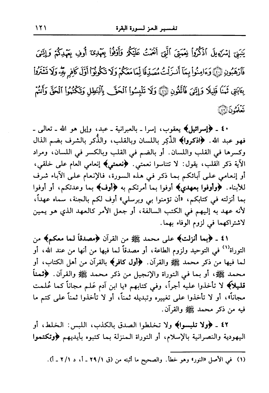 40 - {إسرائيل} يعقوب، إسرا - بالعبرانية - عبد، وإيل هو الله - تعالى - فهو عبد الله /. {أذْكُرُواْ} الذّكِر باللسان وبالقلب، والذكر بالشرف بصم الذال وكسرها في القلب واللسان. أو بالضم في القلب وبالكسر في اللسان، ومراد الآية ذكر القلب، يقول: لا تتناسوا نعمتي. {نِعْمَتىَ} إنعامي العام على خلقي، أو أنعامي على آبائكم بما ذكر في هذه السورة، فالإنعام على الآباء شرف للأبناء. {وَأَوْفُواْ بِعَهْدِى} أوفوا بما أمرتكم به {أوف} بما وعدتكم، أو أوفوا بما أنزلته في كتابكم، " أن تؤمنوا بي وبرسلي " أوف لكم بالجنة، سماه عهداً، لأنه عهد به إليهم في الكتب السالفة، أو جعل الأمر كالعهد الذي هو يمين لاشتراكهما في لزوم الوفاء بهما.