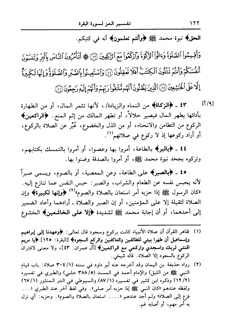 {وأقيموا الصلاة وءاتوا الزكاة واركعوا مع الراكعين (43) أتأمرون الناس بالبر وتنسون أنفسكم وأنتم تتلون الكتاب أفلا تعقلون (44) واستعينوا بالصبر والصلاة وإنها لكبيرة إلا على الخاشعين (45) الذين يظنون أنهم ملاقوا ربهم وأنهم إليه راجعون (46) } [9 / أ]