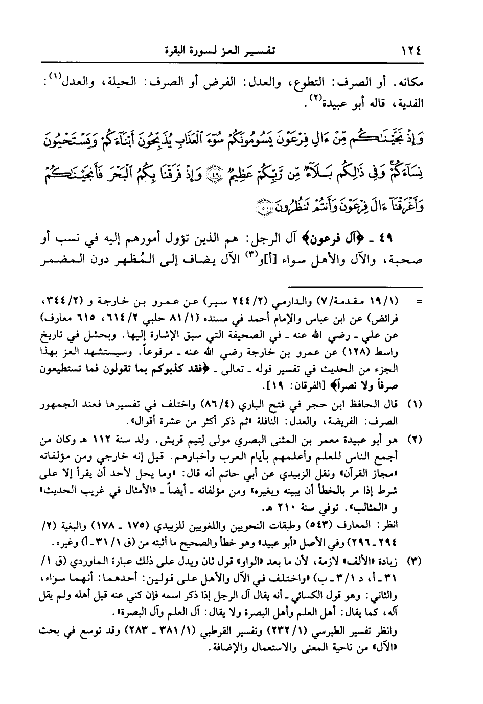 49 - {آل فرعون} آل الرجل: هم الذين تؤول أمورهم إليه في نسب أو صحبة، والآل والأهل سواء [أ] والآل يضاف إلى المُظهر دون المضمر
