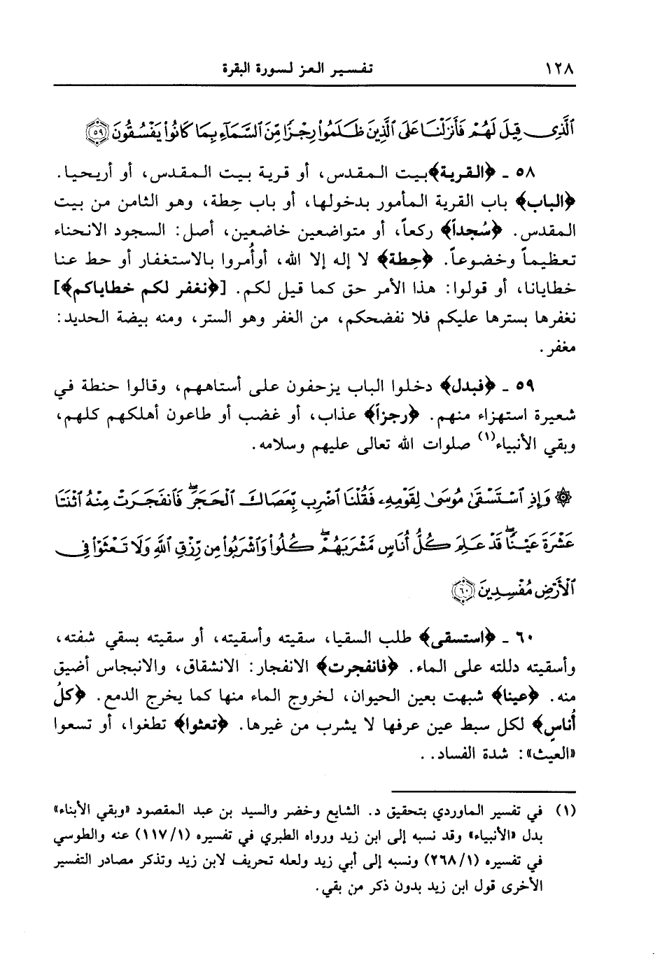 58 - {الْقَرْيَةَ} بيت المقدس، أو قرية بيت المقدس، أو أريحيا. {الْبَابَ} باب القرية المأمور بدخولها، أو باب حِطة، وهو الثامن من بيت المقدس. {سُجَّداً} ركعاً، أو متواضعين خاضعين، أصل: السجود الانحناء تعظيماً وخضوعاً. {حِطَّةٌ} لا إله إلا الله، أو أُمروا بالاستغفار أو حط عنا خطايانا، أو قولوا: هذا الأمر حق كما قيل لكم. [ {نَّغْفِرْ لَكُمْ خَطَايَاكُمْ} ] نغفرها بسترها عليكم فلا نفضحكم، من الغفر وهو الستر، ومنه بيضة الحديد: مغفر.