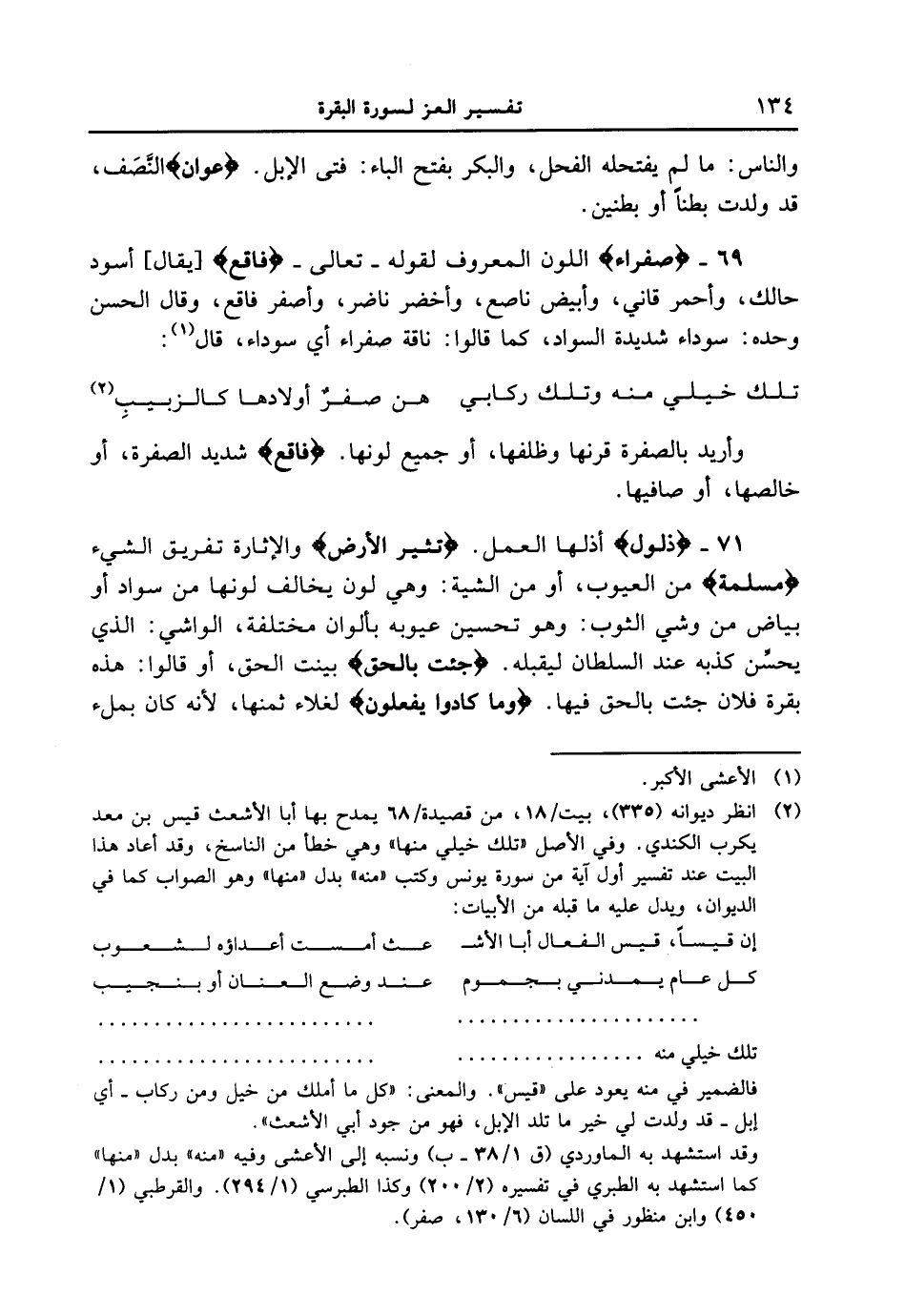 69 - {صَفْرَآءُ} اللون المعروف لقوله - تعالى - {فَاقِعٌ} [يقال] أسود حالك، وأحمر قاني، وأبيض ناصع، وأخضر ناضر، وأصفر فاقع، وقال الحسن وحده: سوداء شديدة السواد، كما قالوا: ناقة صفراء أي سوداء، قال: