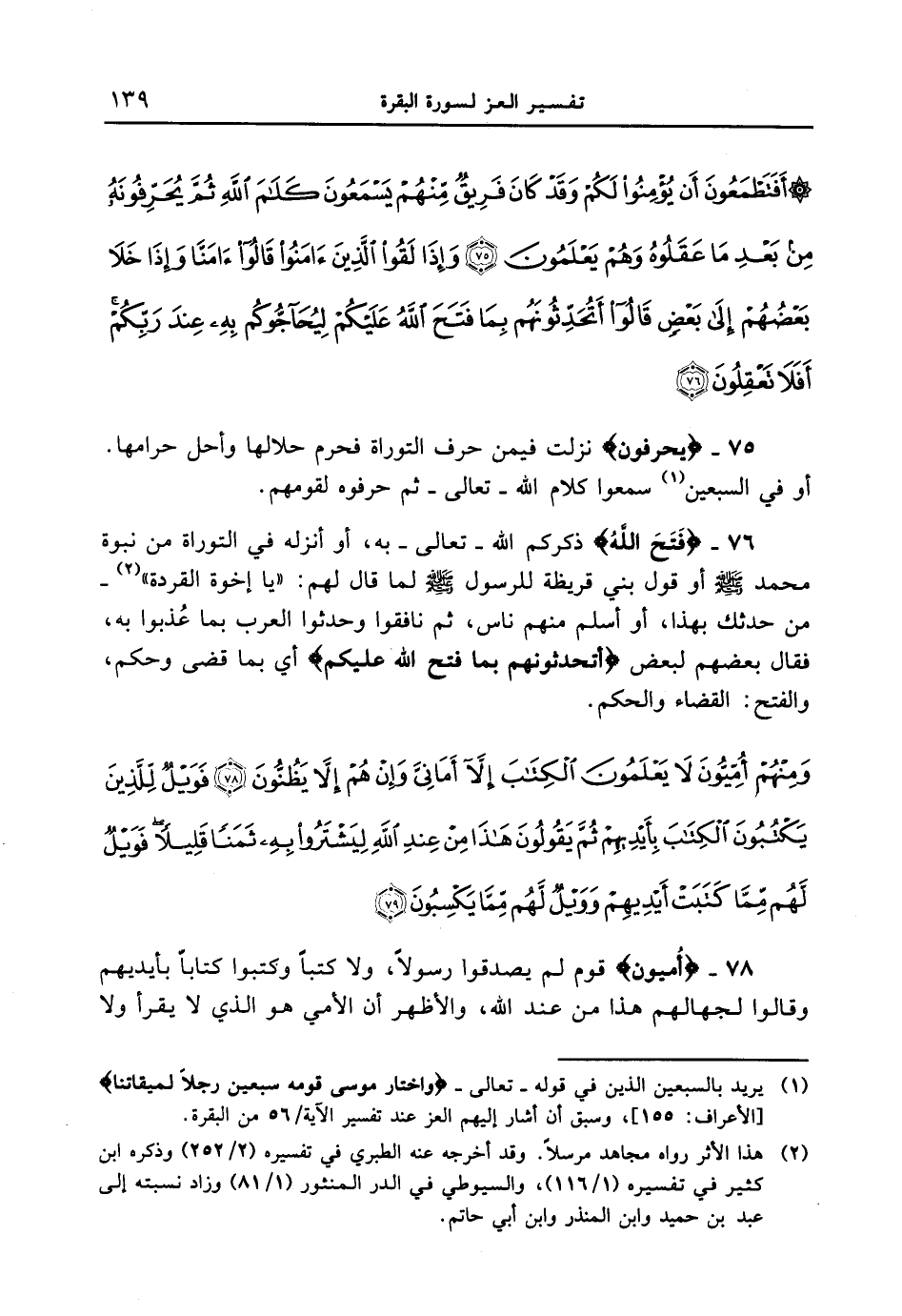 75 - {يحرفون} نزلت فيمن حرّف التوراة فحرّم حلالها وأحل حرامها. أو في السبعين سمعوا كلام الله - تعالى - ثم حرّفوه لقومهم.