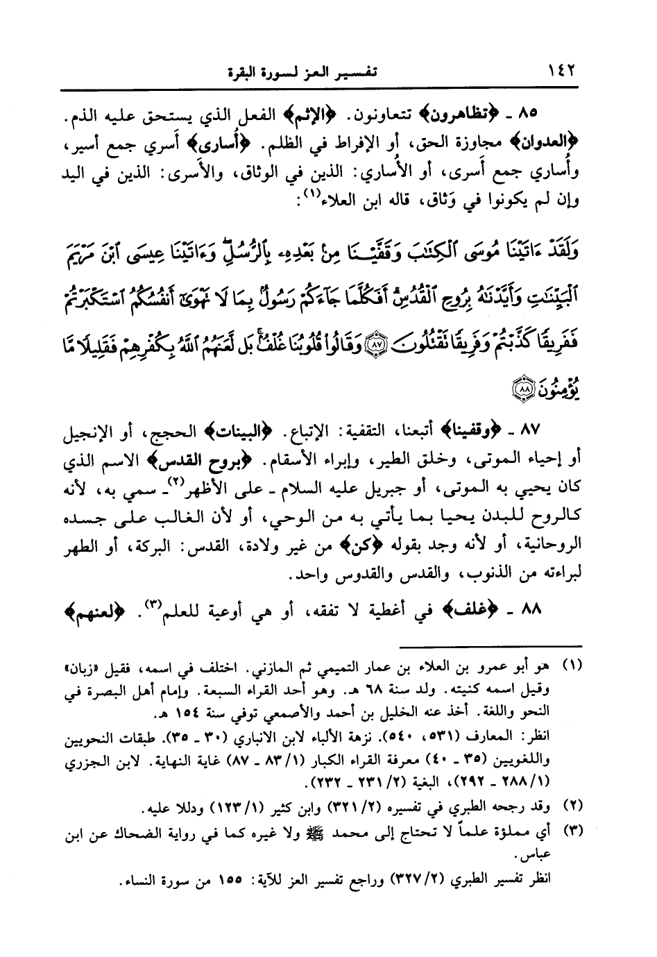 85 - {تَظَاهَرُونَ} تتعاونون. {الإِثْمِ} الفعل الذي يستحق عليه الذم. {العدوان} مجاوزة الحق، أو الإفراط في الظلم. {أُسَارَى} أَسري جمع أسير، وأُساري جمع أَسرى، أو الأُساري: الذين في الوثاق، والأَسرى: الذين في اليد وإن لم يكونوا في وثاق، قاله ابن العلاء: