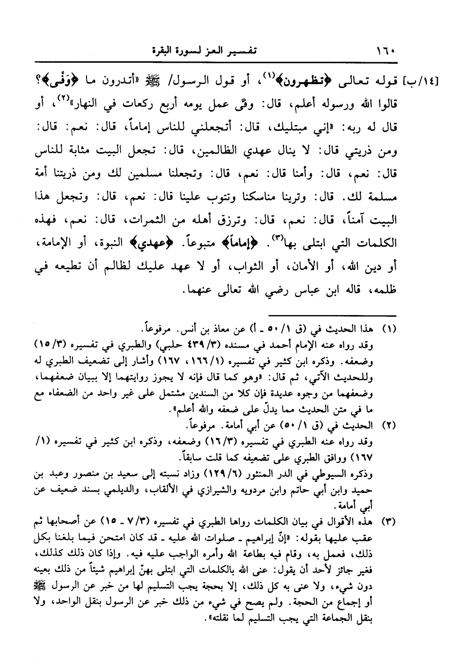 قوله تعالى {تظهرون} ، أو قول الرسول / صلى الله عليه وسلم " أتدرون ما {وَفَّيَ} ؟ قالوا الله ورسوله أعلم، قال: وفيَّ عمل يومه أربع ركعات في النهار "، أو قال له ربه: " إني مبتليك، قال: أتجعلني للناس إماماً، قال: نعم: قال: ومن ذريتي قال: لا ينال عهدي الظالمين، قال: تجعل البيت مثابة للناس قال: نعم، قال: وأمنا قال: نعم، قال: وتجعلنا مسلمين لك ومن ذريتنا أمة مسلمة لك. قال: وترينا مناسكنا وتتوب علينا قال: نعم، قال: وتجعل هذا البيت آمناً، قال: نعم، قال: وترزق أهله من الثمرات، قال: نعم، فهذه الكلمات التي أبتُلى بها. {إمَاماً} متبوعاً. {عَهْدِى} النبوة، أو الإمامة، أو دين الله، أو الأمان، أو الثواب، أو لا عهد عليك لظالم أن تطيعه في ظلمة، قاله ابن عباس رضي الله تعالى عنهما.