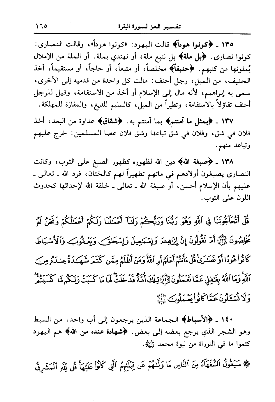 135 - {كُونُواْ هُوداً} قالت اليهود: " كونوا هوداً "، وقالت النصارى: كونوا نصارى. {بَلْ مِلَّةَ} بل نتبع ملة، أو نهتدي بملة. أو الملة من الإملال يُملونها من كتبهم. {حَنِيفاً} مخلصاً، أو متبعاً، أو حاجاً، أو مستقيماً، أخذ الحنيف، من الميل، رجل أحنف: مالت كل واحدة من قدميه إلى الأخرى، سمى به إبراهيم، لأنه مال إلى الإسلام أو أخذ من الاستقامة، وقيل للرجل أحنف تفاؤلاً بالاستقامة، وتطيراً من الميل، كالسليم للديغ، والمفازة للمهلكة.