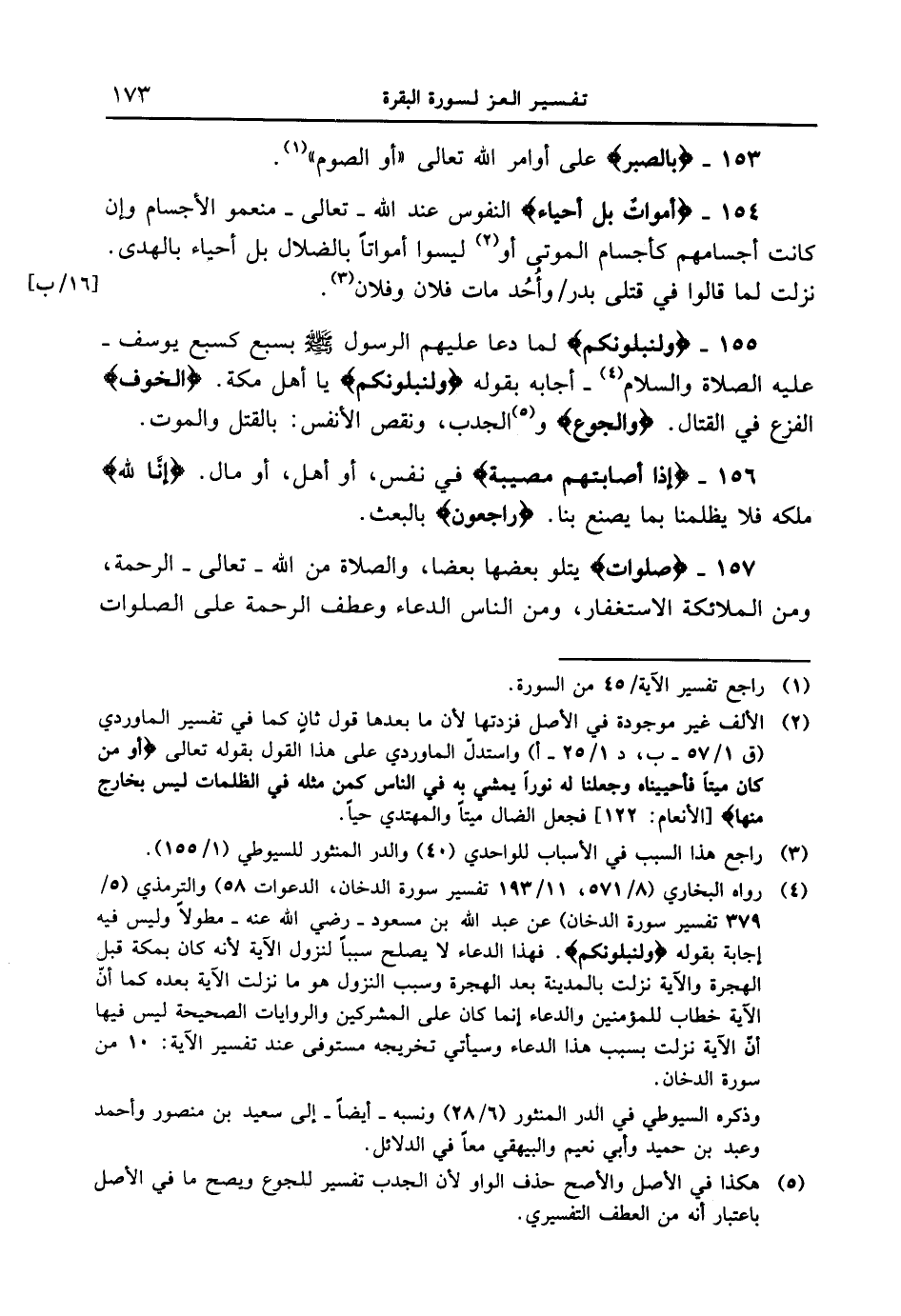 154 - {أَمْوَاتٌ بَلْ أَحْيَآءٌ} النفوس عند الله - تعالى - منعمو الأجسام وإن كانت أجسامهم كأجسام الموتى أو ليسوا أمواتاً بالضلال بل أحياء بالهدى. نزلت لما قالوا في قتلى بدر / وأُحُد مات فلان وفلان.