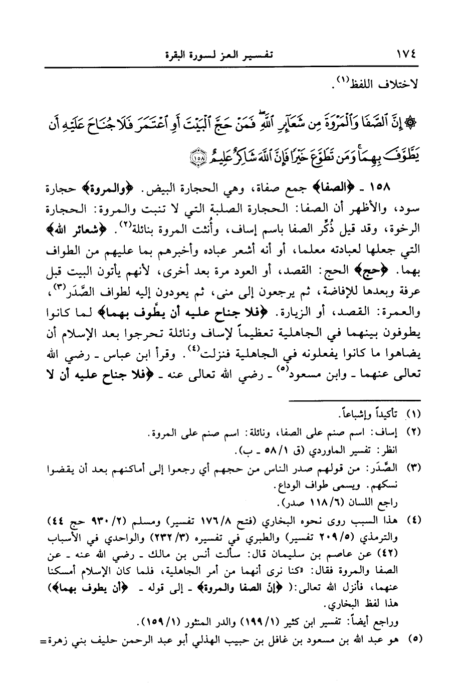 158 - {الصَّفَا} جمع صفاة، وهي الحجارة البيض. {وَالْمَرْوَةَ} حجارة سود، والأظهر أن الصفا: الحجارة الصلبة التي لا تنبت والمروة: الحجارة الرخوة، وقد قيل ذُكِّر الصفا باسم إساف، وأُنثت المروة بنائلة. {شَعَآئِرِ اللَّهِ} التي جعلها لعبادته معلماً، أو أنه أشعر عباده وأخبرهم بما عليهم من الطواف بهما. {حَجَّ} الحج: القصد، أو العود مرة بعد أخرى، لأنهم يأتون البيت قبل عرفة وبعدها للإفاضة، ثم يرجعون إلى منى، ثم يعودون إليه لطواف الصَّدَر، والعمرة: القصد، أو الزيارة. {فَلاَ جُنَاحَ عَلَيْهِ أّن يَطَّوَّفَ بِهِمَا} لما كانوا يطوفون بينهما في الجاهلية تعظيماً لإساف ونائلة تحرجوا بعد الإسلام أن يضاهوا ما كانوا يفعلونه في الجاهلية فنزلت. وقرأ ابن عباس - رضي الله تعالى عنهما - وابن مسعود - رضي الله تعالى عنه - {فلا جناح عليه أن لا