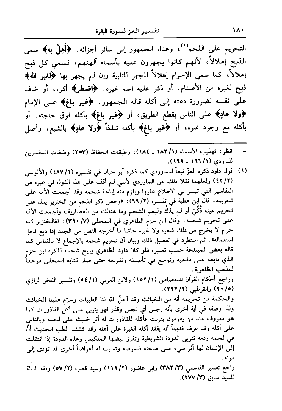 التحريم على اللحم، وعداه الجمهور إلى سائر أجزائه. {أهل به} سمى الذبح إهلالاً، لأنهم كانوا يجهرون عليه بأسماء آلهتهم، فسمي كل ذبح إهلالاً، كما سمي الإحرام إهلالاً للجهر للتلبية وإن لم يجهر بها {لِغَيْرِ اللَّهِ} ذبح لغيره من الأصنام. أو ذكر عليه اسم غيره. {اضْطُرَّ} أكره، أو خاف على نفسه لضرورة دعته إلى أكله قاله الجمهور. {غَيْرَ بَاغٍ} على الإمام {وَلاَ عَادٍ} على الناس بقطع الطريق، أو {غَيْرَ بَاغٍ} بأكله فوق حاجته. أو بأكله مع وجود غيره، أو {غَيْرَ بَاغٍ} بأكله تلذذاً {وَلاَ عَادٍ} بالشبع، وأصل