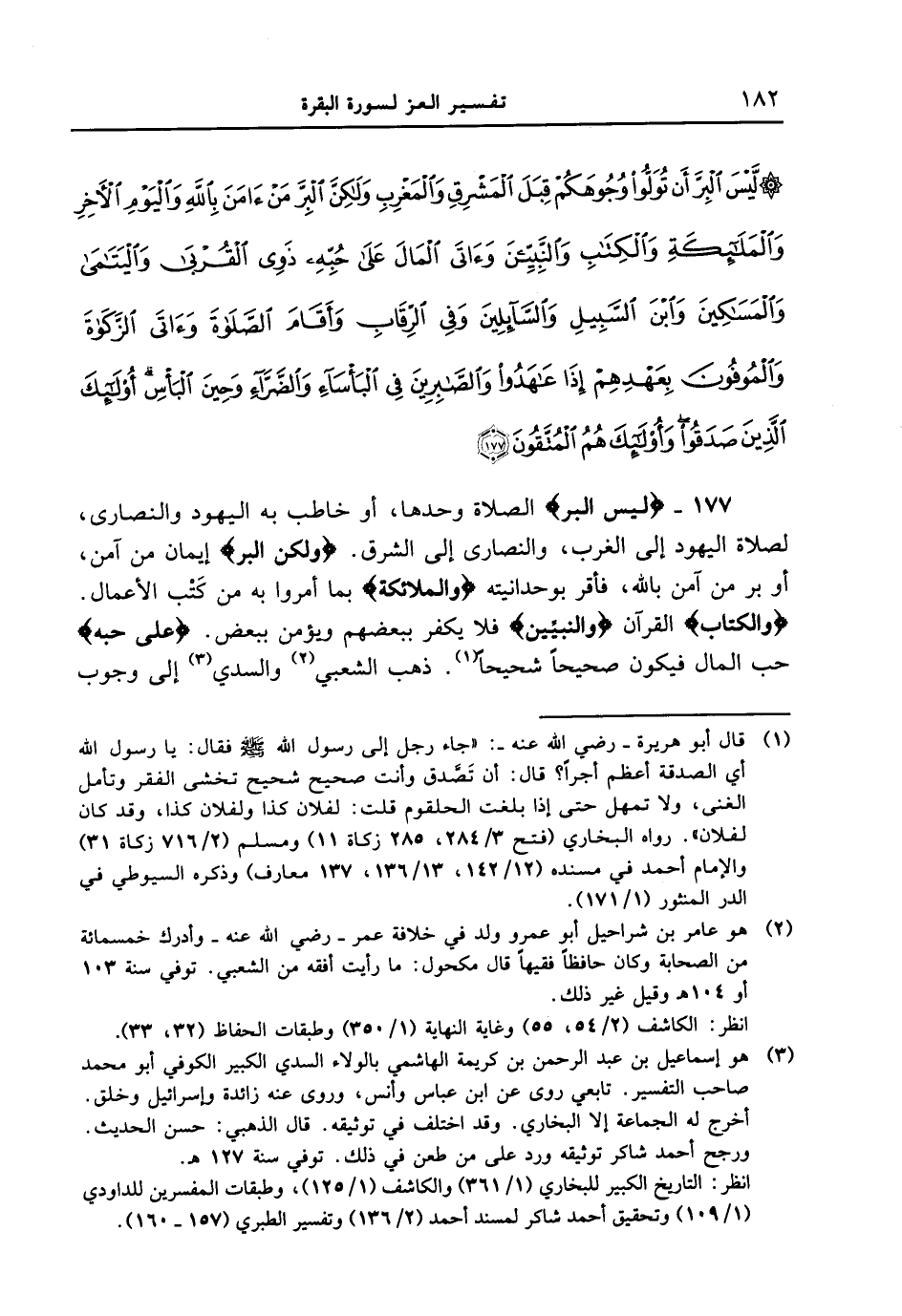 177 - {لَّيْسَ الْبِرَّ} الصلاة وحدها، أو خاطب به اليهود والنصارى، لصلاة اليهود إلى الغرب، والنصارى إلى الشرق. (وَلكِنَّ الْبِرَّ} إيمان من آمن، أو برّ من آمن بالله، فأقر بوحدانيته {وَالْمَلآئِكَةِ} بما أُمروا به من كَتْب الأعمال. {والكتاب) {القرآن} (والنبيين} فلا يكفر ببعضهم ويؤمن ببعض. {عَلَى حُبِّهِ} حب المال فيكون صحيحاً شحيحاً. ذهب الشعبي والسدي إلى وجوب