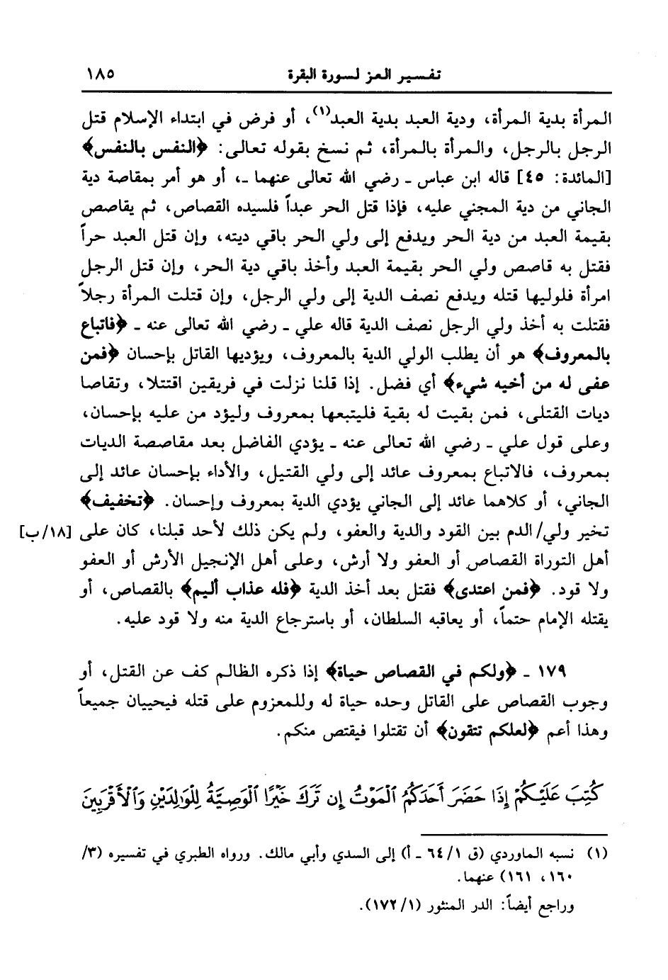 179 - {وَلَكُمْ فِي الْقِصَاصِ حَيَاةٌ} إذا ذكره الظالم كف عن القتل، أو وجوب القصاص على القاتل وحده حياة له وللمعزوم على قتله فيحييان جميعاً وهذا أعم {لَعَلَّكُمْ تَتَّقُونَ} أن تقتلوا فيقتص منكم. {كتب عليكم إذا حضر أحدكم الموت إن ترك خيراً الوصية للوالدين والأقربين