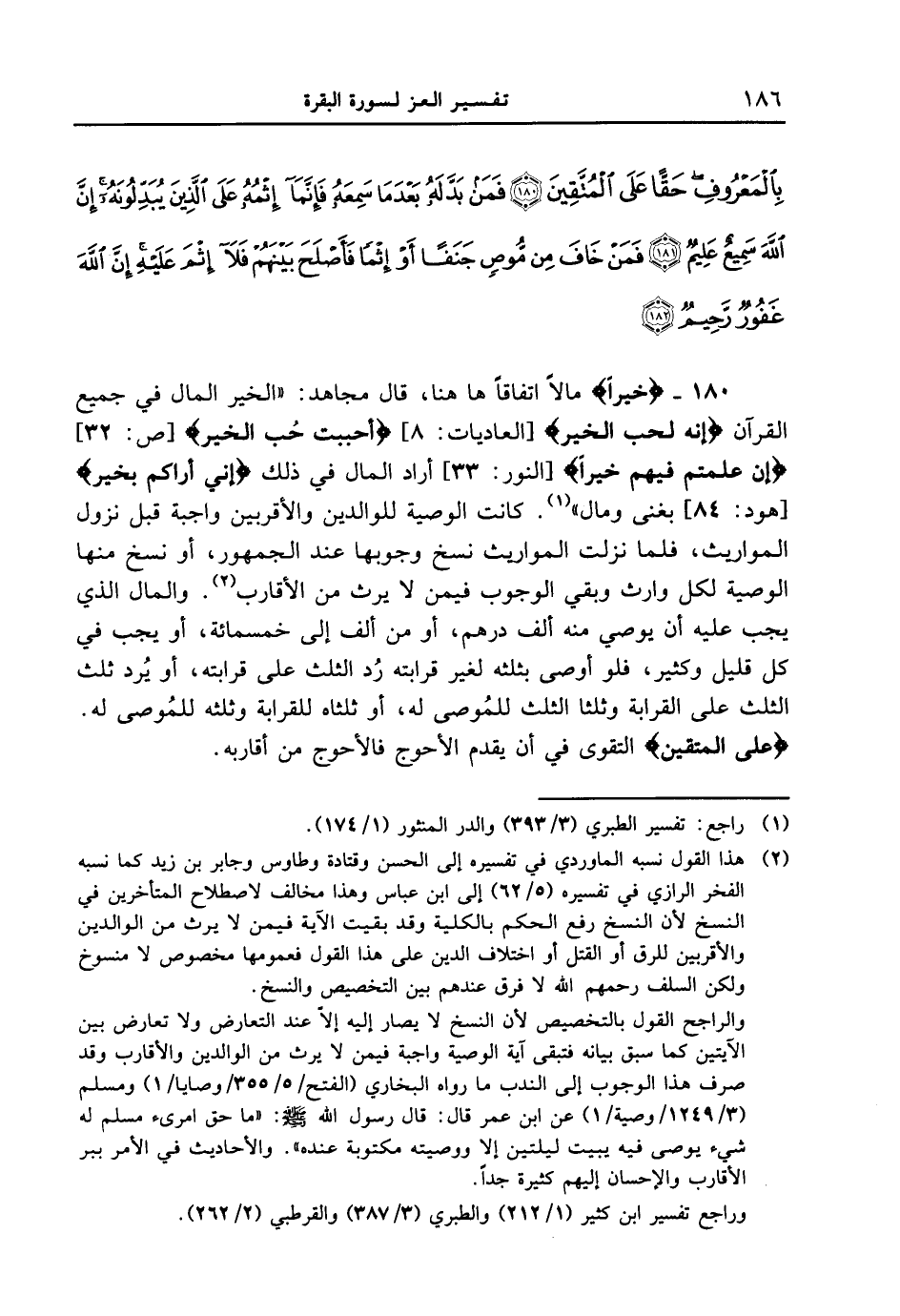 180 - {خَيْراً} مالاً اتفاقاً ها هنا، قال مجاهد: " الخير المال في جميع القرآن {إنه لحب الخير} [العاديات: 8] {أَحْبَبْتُ حُبَّ الخير} [ص: 32] {إِنْ عَلِمُتُمْ فِيهِمْ خَيْراً} [النور: 33] أراد المال في ذلك {إني أَرَاكُمْ بِخَيْرٍ} [هود: 84] بغنى ومال ". كانت الوصية للوالدين والأقربين واجبة قبل نزول المواريث، فلما نزلت المواريث نسخ وجوبها عند الجمهور، أو نسخ منها الوصية لكل وارث وبقي الوجوب فيمن لا يرث من الأقارب. والمال الذي يجب عليه أو أن يوصي منه ألف درهم، أو من ألف إلى خمسمائة، أو يجب في كل قليل وكثير، فلو أوصى بثلثه لغير قرابته رُد الثلث على قرابته، أو يُرد ثلث الثلث على القرابة وثلثا الثلث للمُوصى له، أو ثلثاه للقرابة وثلثه للمُوصى له. {عَلَى الْمُتَّقِينَ} التقوى في أن يقدم الأحوج فالأحوج من أقاربه.