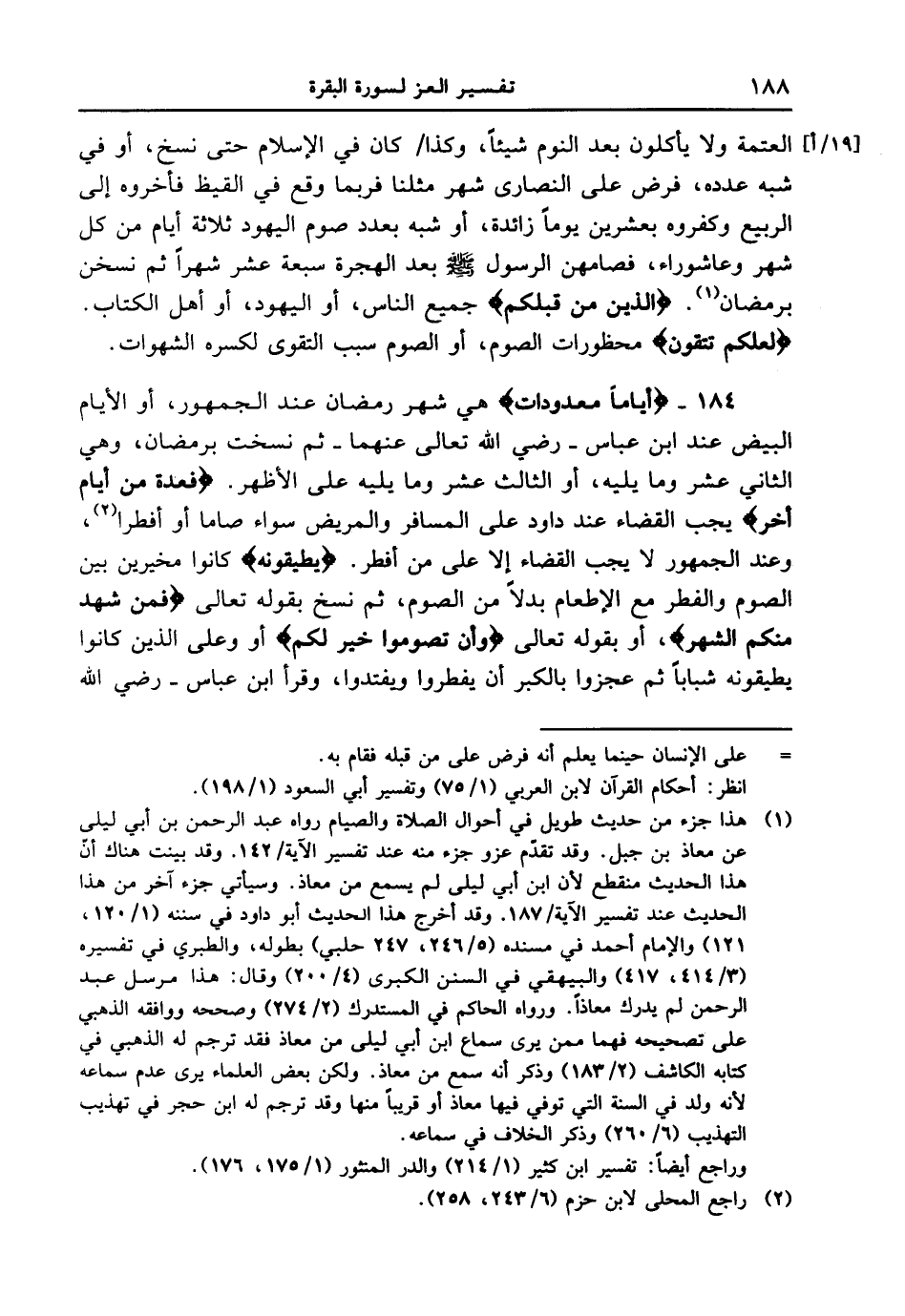 184 - {أَيَّاماً مَّعْدُودَاتٍ} هي شهر رمضان عند الجمهور، أو الأيام البيض عند ابن عباس - رضي الله تعالى عنهما - ثم نسخت برمضان، وهي الثاني عشر وما يليه، أو الثالث عشر وما يليه على الأظهر. {فَعِدَّةٌ مِّنْ أَيَّامٍ أُخَرَ} يجب القضاء عند داود على المسافر والمريض سواء صاما أو أفطرا، وعند الجمهور لا يجب القضاء إلا على من أفطر. {يُطِيقُونَهُ} كانوا مخيّرين بين الصوم والفطر مع الإطعام بدلاً من الصوم، ثم نسخ بقوله تعالى {فَمَن شَهِدَ مِنكُمُ الشَّهْرَ} ، أو بقوله تعالى {وَأَن تَصُومُواْ خَيْرٌ لَّكُمْ} أو وعلى الذين كانوا يطيقونه شباباً ثم عجزوا بالكبر أن يفطروا ويفتدوا، وقرأ ابن عباس - رضي الله