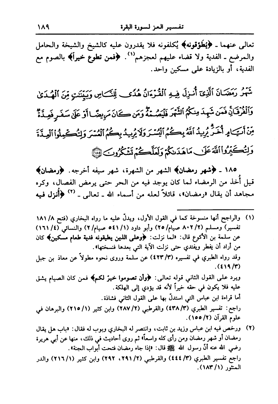 تعالى عنهما - {يطوقونه} يُكلفونه فلا يقدرون عليه كالشيخ والشيخة والحامل والمرضع - الفدية ولا قضاء عليهم لعجزهم. {فَمَن تَطَوَّعَ خَيْرًا} بالصوم مع الفدية، أو بالزيادة على مسكين واحد. {شهر رمضان الذي أنزل فيه القرءان هدى للناس وبينات من الهدى والفرقان فمن شهد منكم الشهر فليصمه ومن كان مريضاً أو على سفر فعدَّةٌ من أيام أخر يريد الله بكم اليسر ولا يريد بكم العسر ولتكملوا العدة ولتكبروا الله على ما هداكم ولعلكم تشكرون (185) }