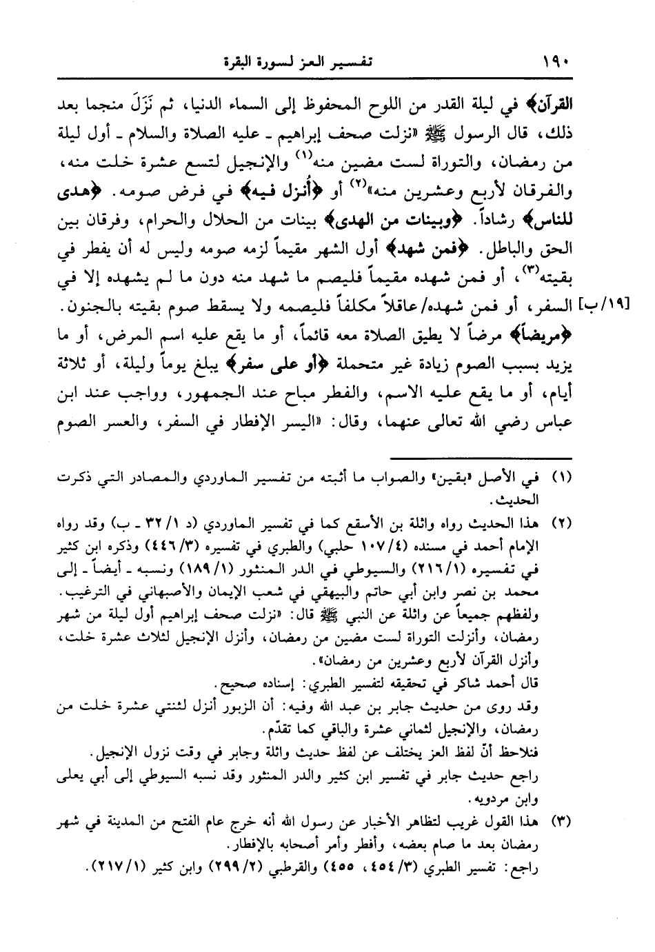 القرآن} في ليلة القدر من اللوح المحفوظ إلى السماء الدنيا، ثم نَزَلَ منجماً بعد ذلك، قال الرسول صلى الله عليه وسلم " نزلت صحف إبراهيم - عليه الصلاة والسلام - أول ليلة من رمضان، والتوراة لست مضين منه والإنجيل لتسع عشرة خلت منه، والفرقان لأربع وعشرين منه " أو {أُنزِلَ فِيهِ} في فرض صومه. {هُدىً لِّلنَّاسِ} رشاداً. {وَبَيِّنَاتٍ مِّنَ الْهُدَى} بينات من الحلال والحرام، وفرقان بين الحق والباطل. {فَمَن شَهِدَ} أول الشهر مقيماً لزمه صومه وليس له أن يفطر في بقيته، أو فمن شهده مقيماً فليصم ما شهد منه دون ما لم يشهده إلا في السفر، أو فمن شهده / عاقلاً مكلفاً فليصمه ولا يسقط صوم بقيته بالجنون. {مَرِيضاً} مرضاً لا يطيق الصلاة معه قائماً، أو ما يقع عليه أسم المرض، أو ما يزيد بسبب الصوم زيادة غير متحملة {أَوْ عَلَى سَفَرٍ} يبلغ يوماً وليلة، أو ثلاثة أيام، أو ما يقع عليه الإسم، والفطر مباح عند الجمهور، وواجب عند ابن عباس رضي الله تعالى عنهما، وقال: " اليسر الإفطار في السفر، والعسر الصوم