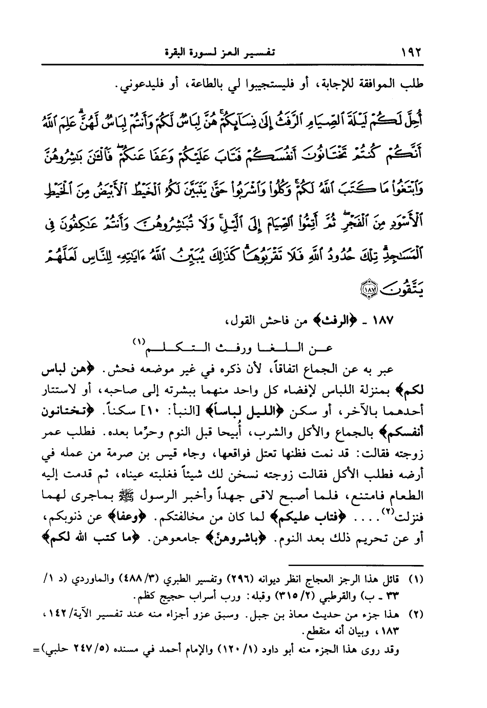 عبّر به عن الجماع اتفاقاً لأن ذكره في غير موضعه فحش. {هُنَّ لِبَاسٌ لَّكُمْ} بمنزلة اللباس لإفضاء كل واحد منهما ببشرته إلى صاحبه، أو لاستتار أحدهما بالآخر، أو سكن {الليل لِبَاساً} [النبأ: 10] سكناً. {تَخْتَانُونَ أَنفُسَكُمْ} بالجماع والأكل والشرب، أُبيحا قبل النوم وحرِّما بعده. فطلب عمر زوجته فقالت: قد نمت فظنها تعتل فواقعها، وجاء قيس بن صرمة من عمله في أرضه فطلب الأكل فقالت زوجته نسخن لك شيئاً فغلبته عيناه، ثم قدمت إليه الطعام فامتنع، فلما أصبح لاقى جهداً وأخبر الرسول صلى الله عليه وسلم بما جرى لهما فنزلت ... . {فَتَابَ عَلَيْكُمْ} لما كان في مخالفتكم. {وَعَفَا} عن ذنوبكم، أو عن تحريم ذلك بعد النوم. {بَاشِرُوهُنَّ} جامعوهن. {مَا كَتَبَ الله لكم}