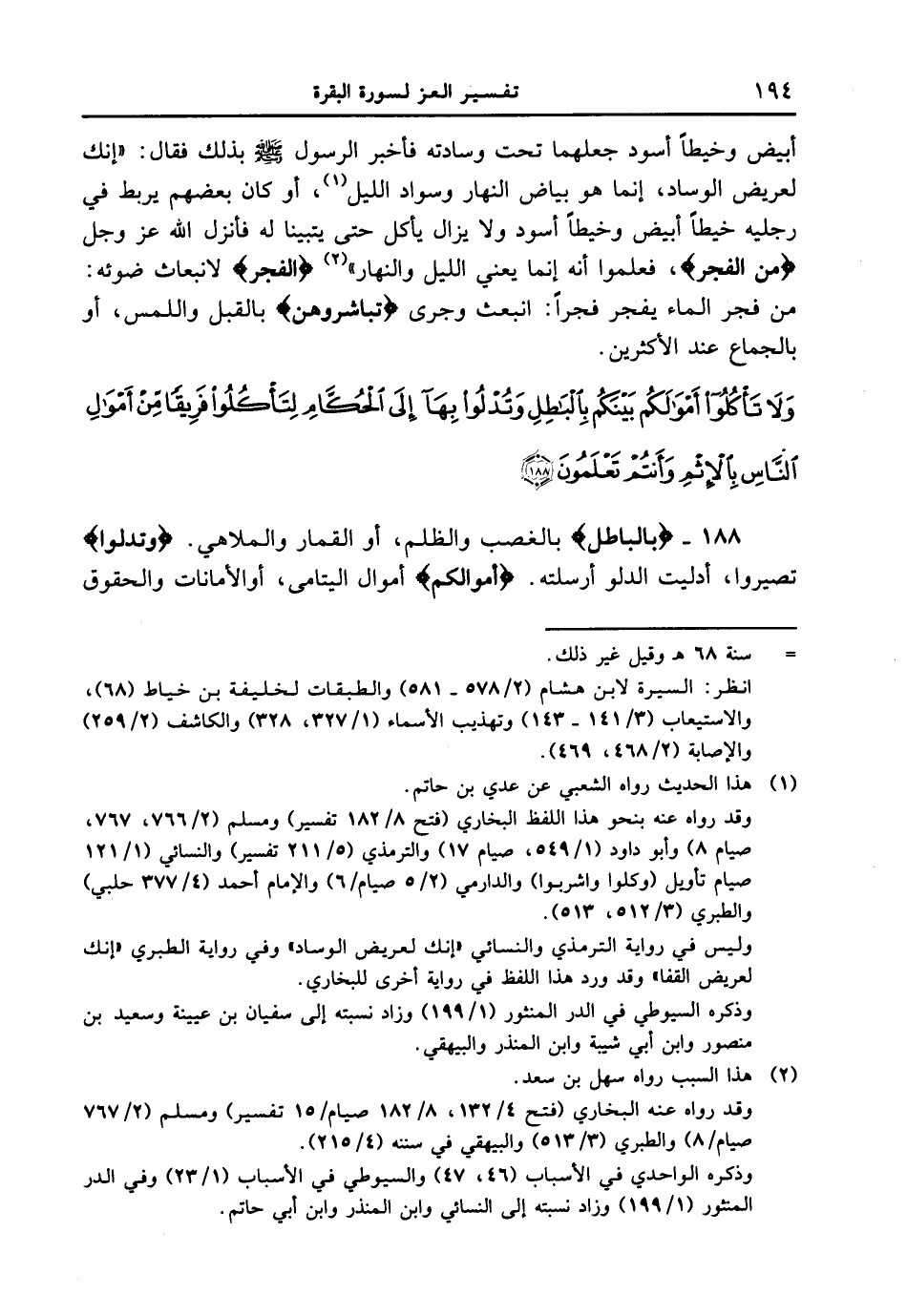 أبيض وخيطاً أسود جعلهما تحت وسادته فأخبر الرسول صلى الله عليه وسلم بذلك فقال: " إنك لعريض الوساد، إنما هو بياض النهار وسواد الليل، أو كان بعضهم يربط في رجليه خيطاً أبيض وخيطاً أسود ولا يزال يأكل حتى يتبينا له فأنزل الله عز وجل {مِنَ الْفَجْرِ} ، فعلموا أنه إنما يعني الليل والنهار " {الْفَجْرِ} لانبعاث ضوئه: من فجر الماء يفجر فجراً: انبعث وجرى {تُبَاشِرُوهُنَّ} بالقبل واللمس، أو بالجماع عند الأكثرين. {ولا تأكلوآ اموالكم بينكم بالباطل وتدلوا بهآ إلى الحكام لتأكلوا فريقاً من أموال الناس بالإثم وأنتم تعلمون (188) }