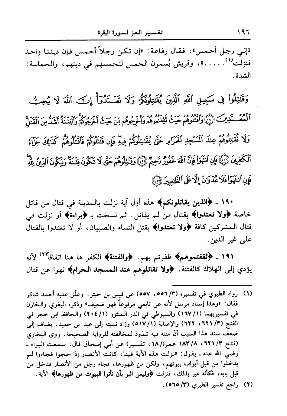 " إني رجل أحمس " فقال رفاعة: " إن تكن رجلاً أحمس فإن ديننا واحد فنزلت ... . "، وقريش يُسمون الحمس لتحمسهم في دينهم، والحماسة: الشدة. {وقاتلوا في سبيل الله الذين يقاتلونكم وَلا تَعْتَدُواْ إِنَّ اللَّهَ لا يُحِبُّ الْمُعْتَدِينَ (190) واقتلوهم حيث ثقفتموهم وأخرجوهم من حيث أخرجوكم والفتنة أشد من القتل ولا تقاتلوهم عند المسجد الحرام حتى يقاتلوكم فيه فإن قاتلوكم فاقتلوهم كذلك جزآء الكافرين (191) فإن انتهوا فإن الله غفور رحيم (192) وقاتلوهم حتى لا تكون فتنة ويكون الدين لله فإن انتهوا فلا عدوان إلاّ على الظالمين (193) }