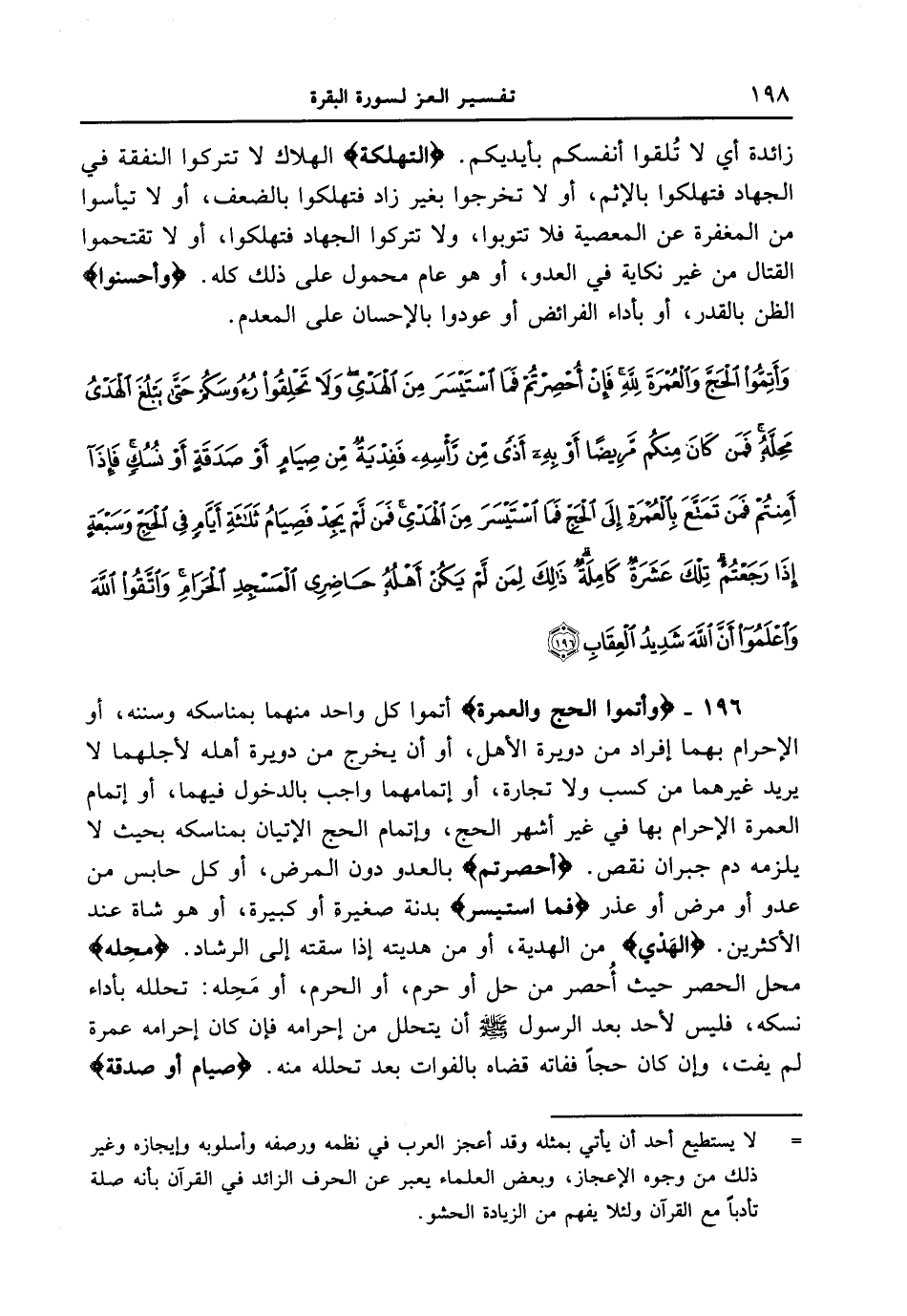196 - {وَأَتِمُّواْ الْحَجَّ وَالْعُمْرَةَ} أتموا كل واحد منهما بمناسكه وسننه، أو الإحرام بهما إفراد من دويرة الاهل، أو أن يخرج من دويرة أهله لأجلهما لا يريد غيرهما من كسب ولا تجارة، أو إتمامهما واجب بالدخول فيهما، أو إتمام العمرة الإحرام بها في غير أشهر الحج، وإتمام الحج الإتيان بمناسكه بحيث لا يلزمه دم جبران نقص. {أُحْصِرْتُمْ} بالعدو دون المرض، أو كل حابس من عدو أو مرض أو عذر {فَمَا اسْتَيْسَرَ} بدنة صغيرة أو كبيرة، أو هو شاة عند الأكثرين. {الْهَدْى} من الهدية، أو من هديته إذا سقته إلى الرشاد. {مَحِلَّهُ} محل الحصر حيث أُحصر من حل أو حرم، أو الحرم، أو مَحِله: تحلله بأداء نسكه، فليس لأحد بعد الرسول صلى الله عليه وسلم أن يتحلل من إحرامه فإن كان إحرامه عمرة لم يفت، وإن كان حجاً ففاته قضاه بالفوات بعد تحلله منه. {صٍيَامٍ أَوْ صدقة}