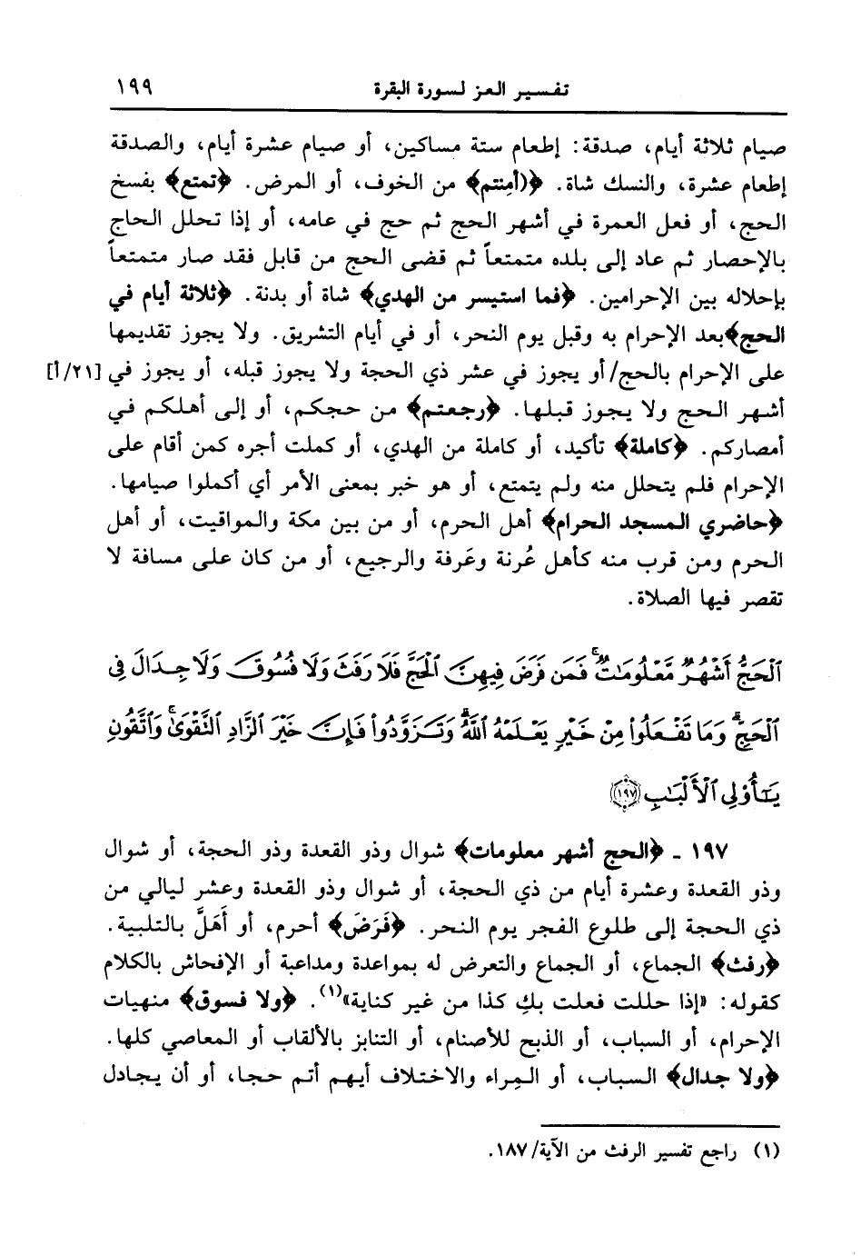 197 - {الْحَجُّ أَشْهُرٌ مَّعْلُومَاتٌ} شوال وذو القعدة وذو الحجة، أو شوال وذو القعدة وعشرة أيام من ذي الحجة، أو شوال وذو القعدة وعشر ليالي من ذي الحجة إلى طلوع الفجر يوم النحر. {فَرَضَ} أحرم، أو أهلَّ بالتلبية. {رَفَثَ} الجماع، أو الجماع والتعرض له بمواعدة ومداعبة أو الإفحاش بالكلام كقوله: " إذا حللت فعلت بكِ كذا من غير كناية ". {وَلا فُسُوقَ} منهيات الإحرام، أو السباب، أو الذبح للأصنام، أو التنابز بالألقاب أو المعاصي كلها. {وَلا جِدَالَ} السباب، أو المِراء والاختلاف أيهم أتم حجاً، أو أن يجادل