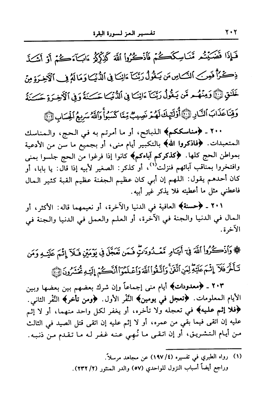 201 - {حسنة} العافية في الدنيا والآخرة، أو نعيمهما قاله: الأكثر، أو المال في الدنيا والجنة في الآخرة، أو العلم والعمل في الدنيا والجنة في الآخرة. {واذكروا الله في أيام معدودات فمن تعجَّل في يومين فلآ إثم عليه ومن تأخَّر فلآ إثم عليه لمن اتقى واتقوا الله واعلموآ أنكم إليه تحشرون (203) }