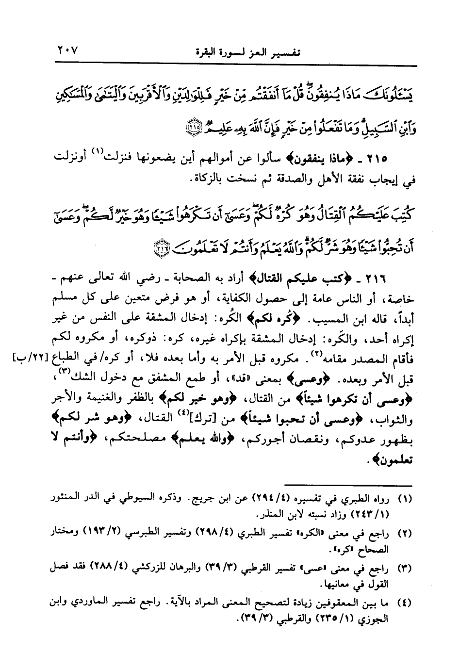 215 - {مَاذَا يُنفِقُونَ} سألوا عن أموالهم اين يضعونها فنزلت أو نزلت في إيجاب نفقة الأهل والصدقة ثم نسخت بالزكاة. {كُتِبَ عَلَيْكُمُ الْقِتَالُ وهو كره لكم وعسى أن تكرهوا شيئاً وهو خير لكم وعسى أن تحبوا شيئاً وهو شرٌ لكم والله يعلم وأنتم لا تعلمون (216) }