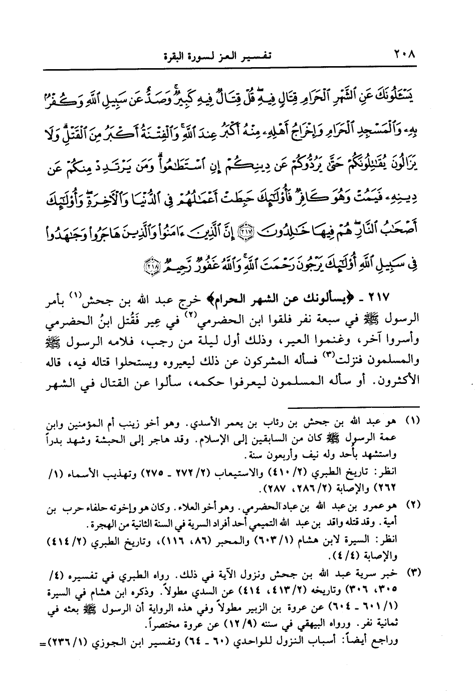 217 - {يسألونك عَنِ الشَّهْرِ الْحَرَامِ} خرج عبد الله بن جحش بأمر الرسول صلى الله عليه وسلم في سبعة نفر فلقوا ابن الحضرمي في عِير فَقُتل ابنُ الحضرمي وأسروا آخر، وغنموا العير، وذلك أول ليلة من رجب، فلامه الرسول صلى الله عليه وسلم والمسلمون فنزلت فسأله المشركون عن ذلك ليعيّروه ويستحلوا قتاله فيه، قاله الأكثرون. أو سأله المسلمون ليعرفوا حكمه، سألوا عن القتال في الشهر