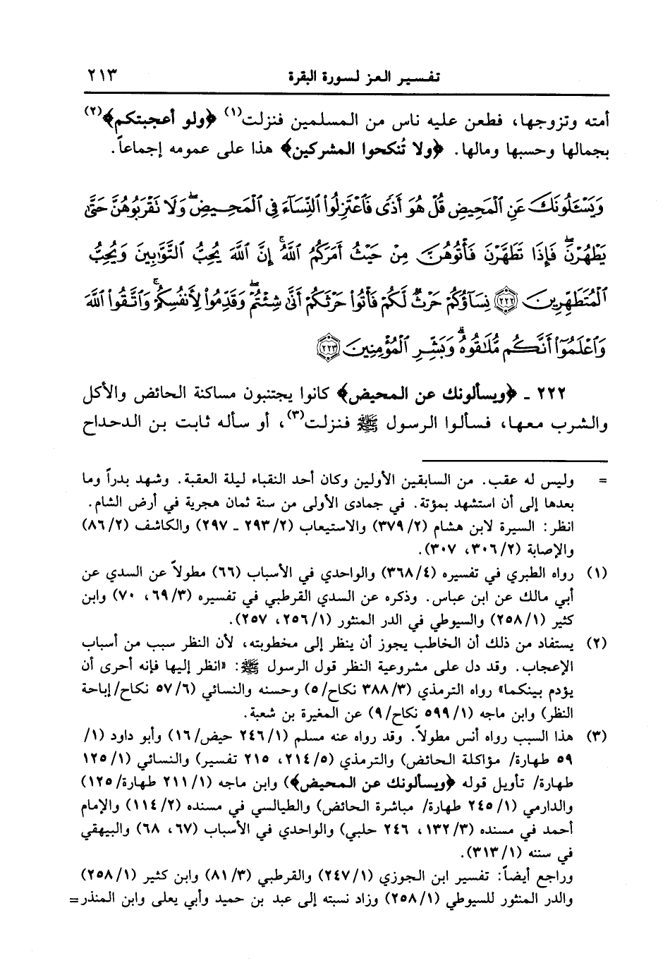 222 - {ويسألونك عَنِ الْمَحِيضِ} كانوا يجتنبون مساكنة الحائض والأكل والشرب معها، فسألوا الرسول صلى الله عليه وسلم فنزلت، أو سأله ثابت بن الدحداح