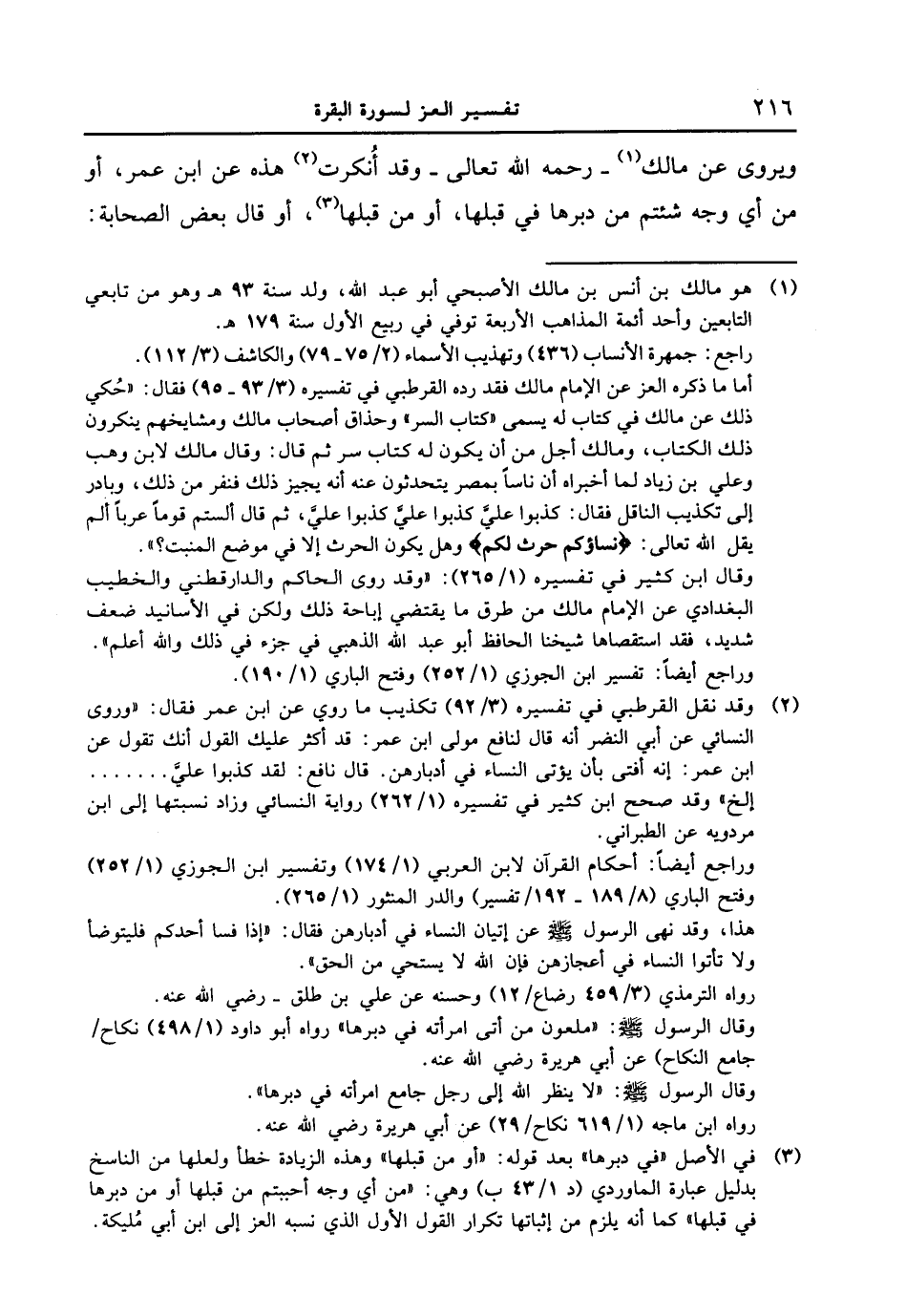 ويروى عن مالك - رحمه الله تعالى - وقد أُنكرت هذه عن ابن عمر، أو من أي وجه شئتم من دبرها في قبلها، أو من قبلها،