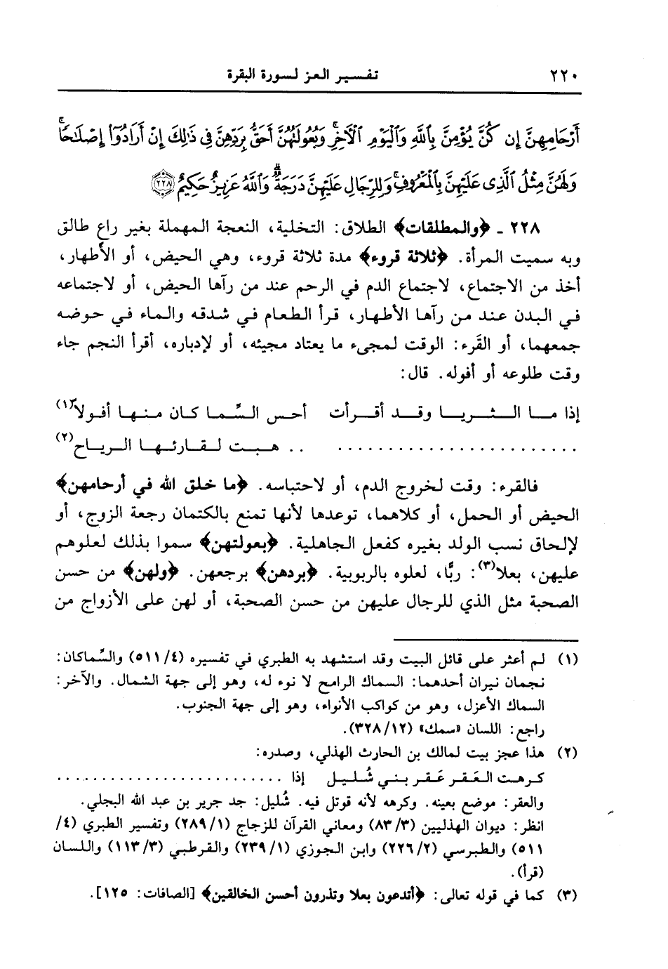 228 - {وَالْمُطَلَّقَاتُ} الطلاق: التخلية، النعجة المهملة بغير راعٍ طالق وبه سميت المرأة. {ثَلاَثَةَ قُرُوءٍ} مدة ثلاثة قروء، وهي الحيض، أو الأطهار، أخذ من الاجتماع، لاجتماع الدم في الرحم عند من رآها الحيض، أو لاجتماعه في البدن عند من رأها الأطهار، قرأ الطعام في شدقه والماء في حوضه جمعهما، أو القَرء: الوقت لمجىء ما يعتاد مجيئه، أو لإدباره، أقرأ النجم جاء وقت طلوعه أو أفوله. قال: