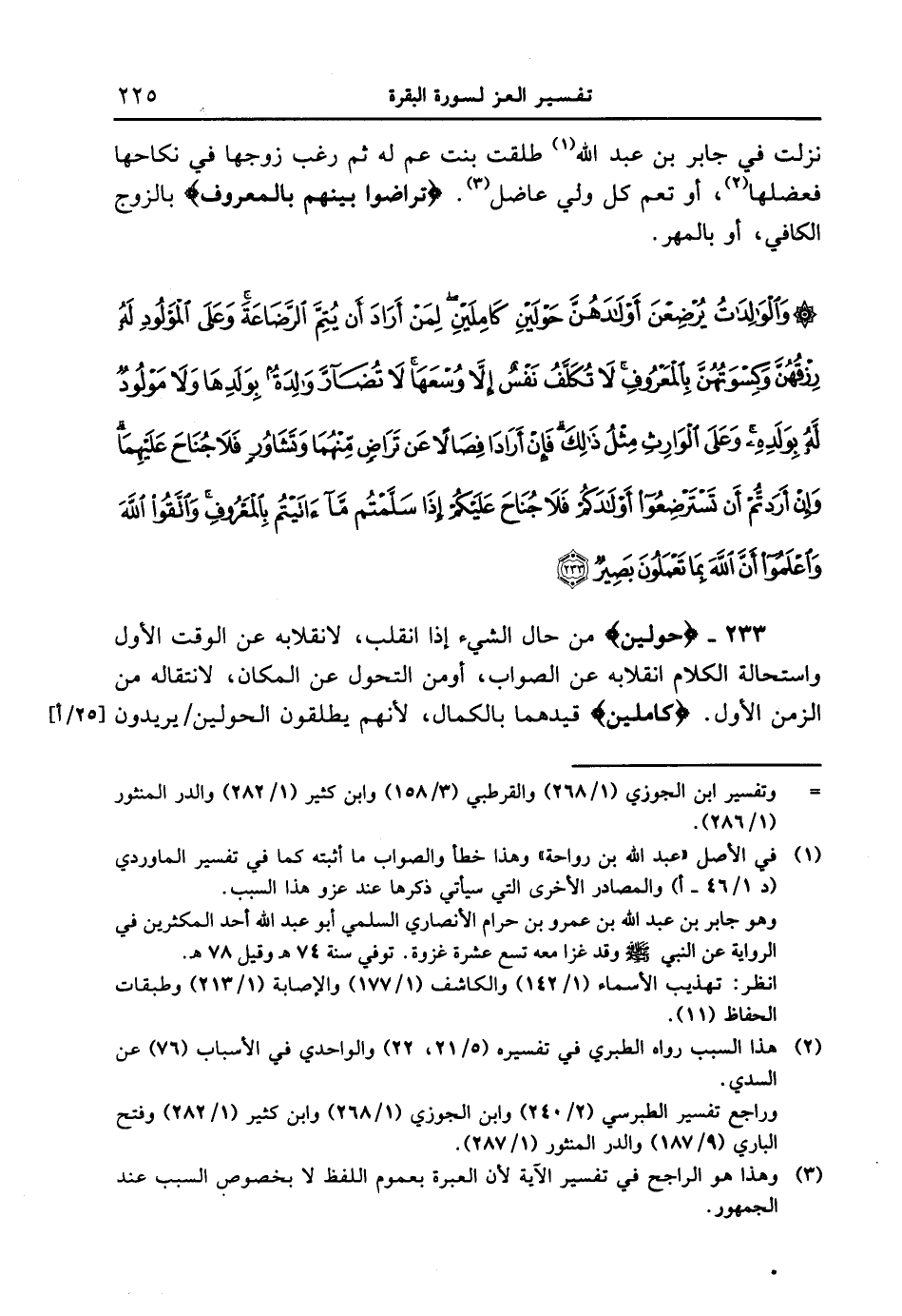 233 - {حَوْلَيْنِ} من حال الشيء إذا انقلب، لانقلابه عن الوقت الأول واستحالة الكلام انقلابه عن الصواب، أو من التحول عن المكان، لانتقاله من الزمن الأول. {كَامِلَيْنِ} قيدهما بالكمال، لأنهم يطلقون الحولين / يريدون