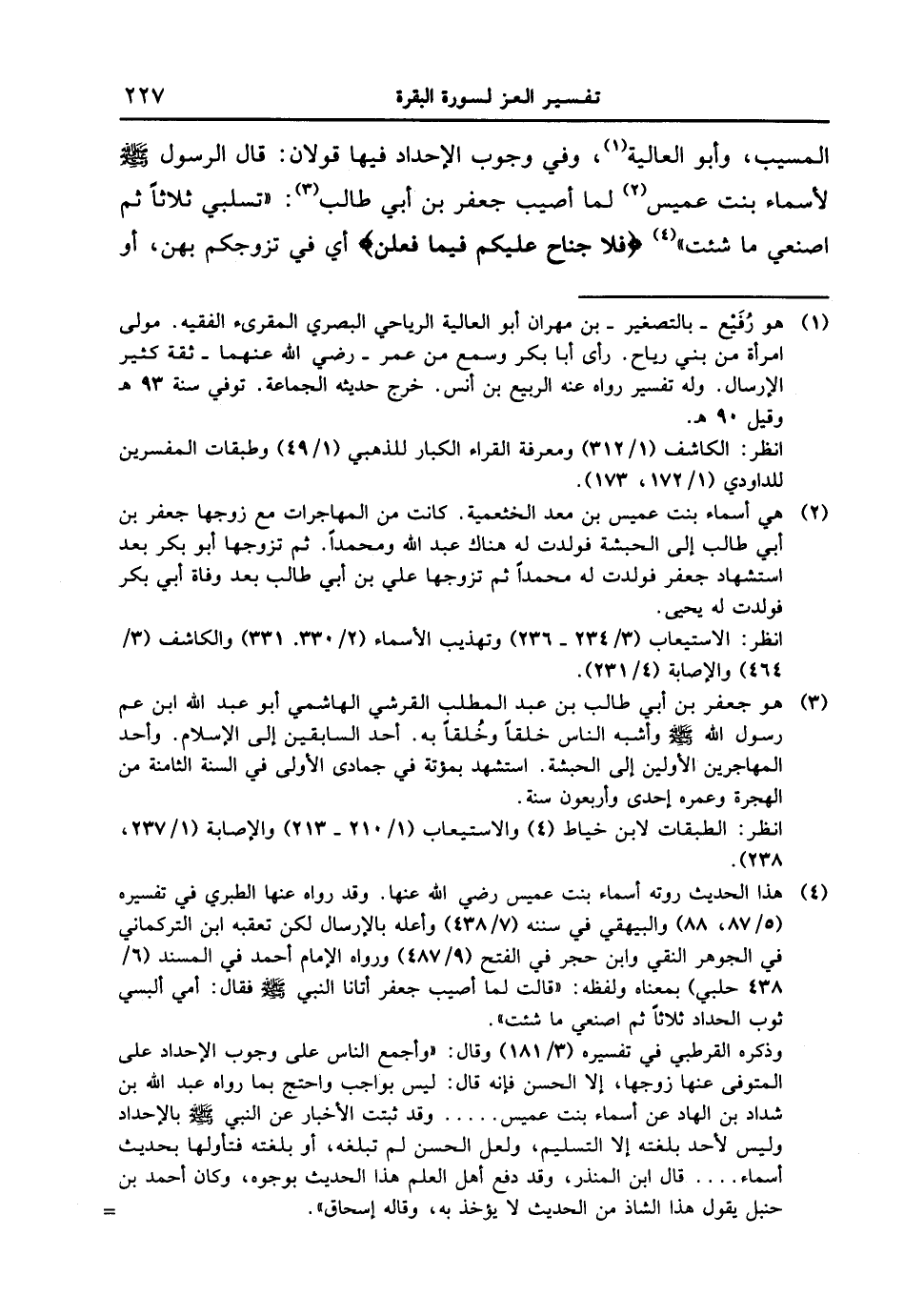 المسيب، وأبو العالية، وفي وجوب الإحداد فيها قولان: قال الرسول صلى الله عليه وسلم لأسماء بنت عميس لما أصيب جعفر بن أبي طالب: " تسلبي ثلاثاُ ثم أصنعي ما شئت " {فَلا جُنَاحَ عَلَيْكُمْ فِيمَا فَعَلْنَ} أي في تزوجكم بهن، أو