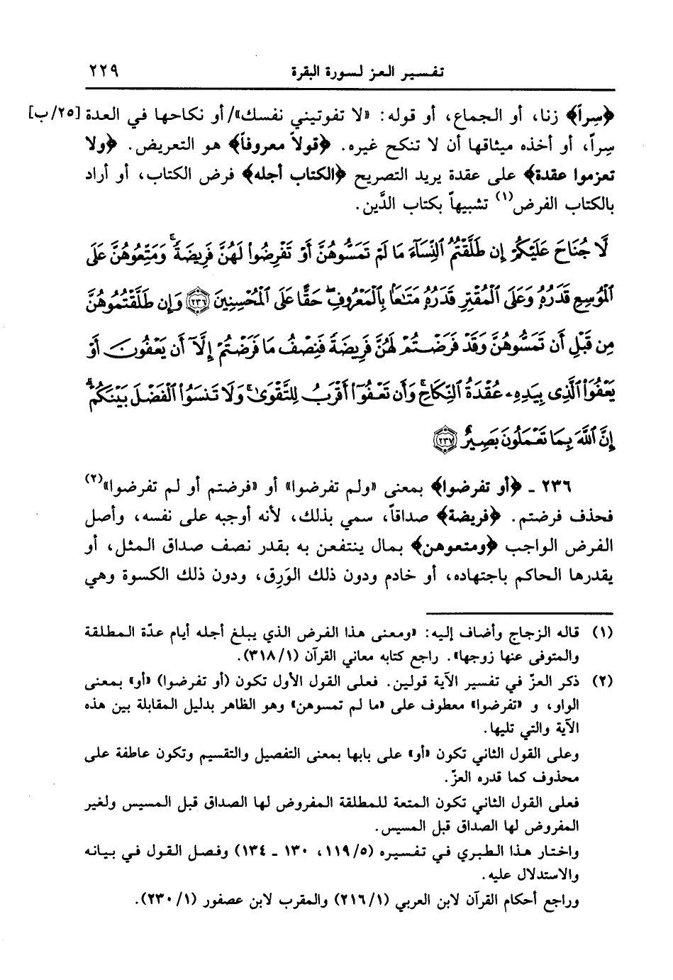 {سِرّاً} زنا، أو الجماع، أو قوله: " لا تفوتيني نفسك " / أو نكاحها في العدة سِراً، أو أخذه ميثاقها أن لا تنكح غيره. {قَوْلاً مَّعْرُوفاً} هو التعريض. {وَلاَ تَعْزِمُواْ عُقْدَةَ} على عقدة يريد التصريح {الْكِتَابُ أَجَلَهُ} فرض الكتاب، أو أراد بالكتاب الفرض تشبيهاً بكتاب الدين. {لا جناح عليكم إن طلقتم النسآء ما لم تمسّوهن أو تفرضوا لهن فريضة ومتعوهن على الموسع قدره وعلى المقتر قدره متاعاً بالمعروف حقاً على المحسنين (236) وإن طلقتموهن من قبل أن تمسوهن وقد فرضتم لهن فريضة فنصف ما فرضتم إلآ أن يعفون أو يعفوا الذي بيده عقدة النكاح وأن تعفوا أقرب للتقوى ولا تنسوا الفضل بينكم إن الله بما تعملون بصير (237) }