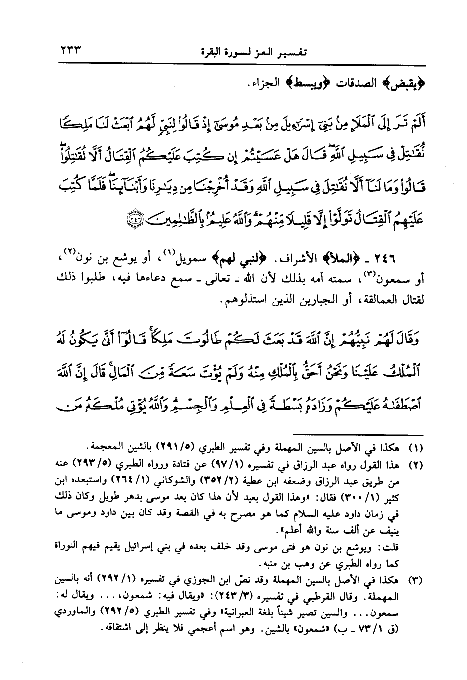 {يقبض} الصدقات {ويبسط} الجزاء. {ألم تر إلى الملإ من بني إسرآءيل من بعد موسى إذ قالوا لنبي لهم ابعث لنا ملكاً نقاتل في سبيل الله قال هل عسيتم إن كتب عليكم القتال ألا تقاتلوا قالوا وما لنا ألا نقاتل في سبيل الله وقد أخرجنا من ديارنا وأبنآئنا فلما كتب عليهم القتال تولّوا إلا قليلاً منهم والله عليم بالظالمين (246) }