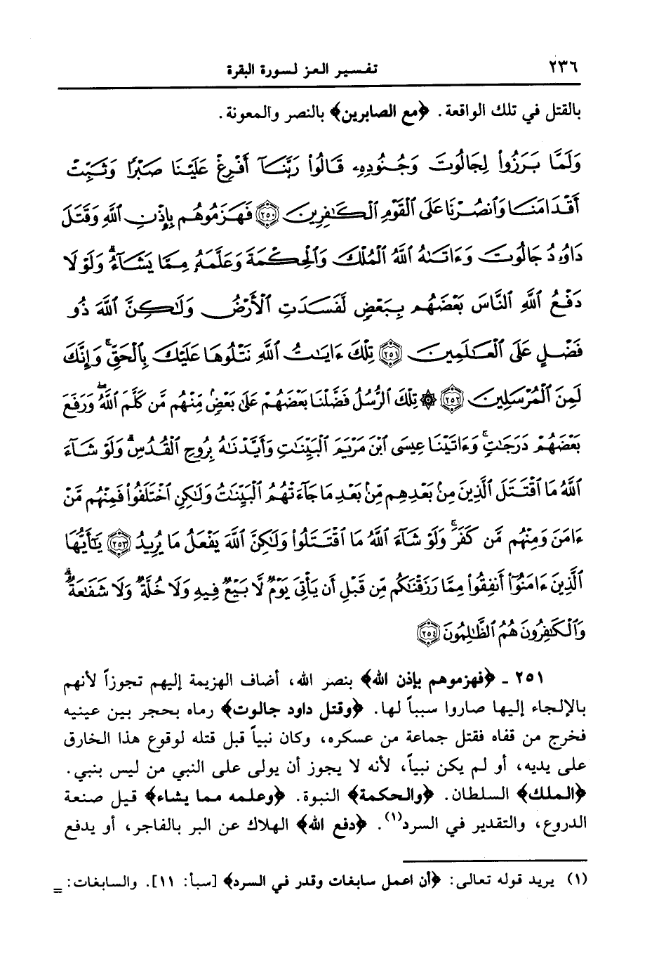251 - {فَهَزَمُوهُم بِإِذْنِ اللَّهِ} بنصر الله، أضاف الهزيمة إليهم تجوزاً لأنهم بالإلجاء إليها صاروا سبباً لها. {وَقَتَلَ دَاوُدُ جَالُوتَ} رماه بحجر بين عينيه فخرج من قفاه فقتل جماعة من عسكره، وكان نبياً قبل قتله لوقوع هذا الخارق على يديه، أو لم يكن نبياً، لأنه لا يجوز أن يولى على النبي من ليس بنبي. {الْمُلْكَ} السلطان. {وَالْحِكْمَةَ} النبوة. {وَعَلَّمَهُ مِمَّا يَشَاءُ} قيل صنعة الدروع، والتقدير في السرد. {دفع الله} الهلاك عن البر بالفاجر، أو يدفع