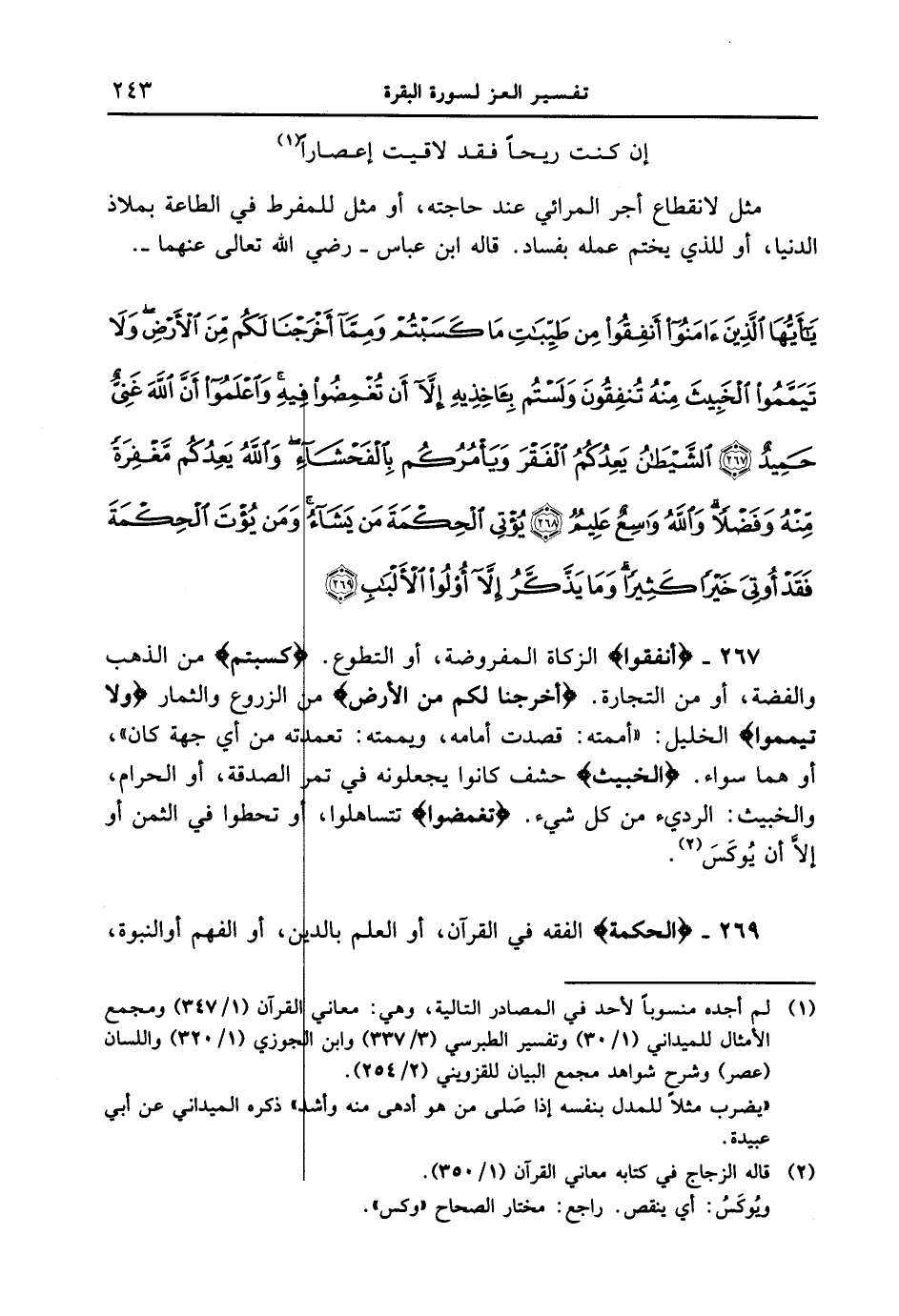 267 - {أنفقوا} الزكاة المفروضة، أو التطوع. {كَسَبْتُمْ} من الذهب والفضة، أو من التجارة. {أَخْرَجْنَا لَكُم مِّنَ الأَرْضِ} من الزروع والثمار {وَلا تَيَمَّمُواْ} الخليل: " أممته: قصدت أمامه، ويممته: تعمدته من أي جهة كان "، أو هما سواء. {الْخَبِيثَ} حشف كانوا يجعلونه في تمر الصدقة، أو الحرام، والخبيث: الرديء من كل شيء. {تُغْمِضُواْ} تتساهلوا، أو تحطوا في الثمن أو إلاَّ أن يُوكَسَ.