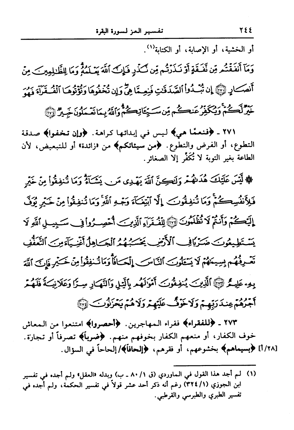 273 - {لِلْفُقَرَآءِ} فقراء المهاجرين. {أُحْصِرُواْ} امتنعوا من المعاش خوف الكفار، أو منعهم الكفار بخوفهم منهم. {ضَرْباً} تصرفاً أو تجارة. {بِسِيمَاهُمْ} بخشوعهم، أو فقرهم، {إِلْحَافاً} / إلحاحاً في السؤال.