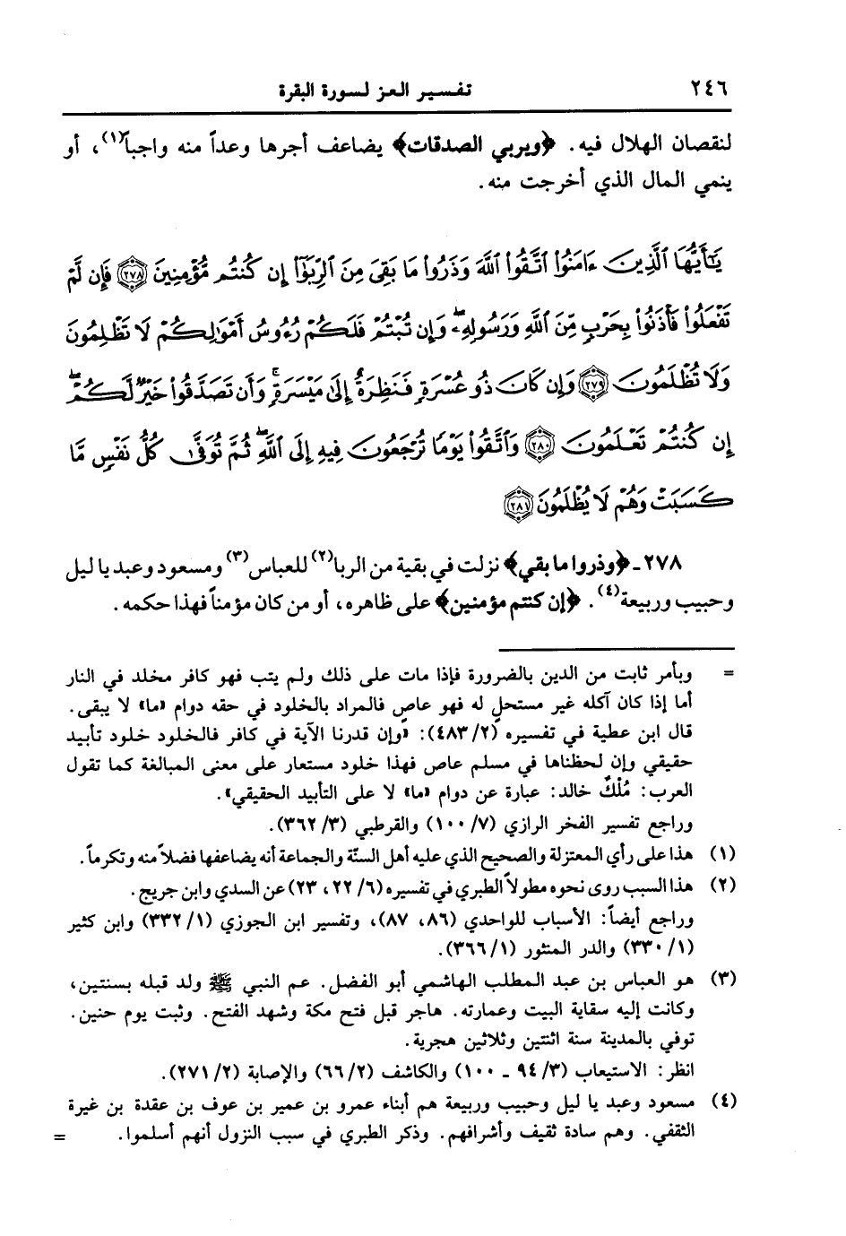 278 - {وَذَرُواْ مَا بَقِىَ} نزلت في بقية من الربا للعباس ومسعود وعبد يا ليل وحبيب وربيعة. {إِن كُنتُم مُّؤْمِنِينَ} على ظاهره، أو من كان مؤمناً فهذا حكمه.