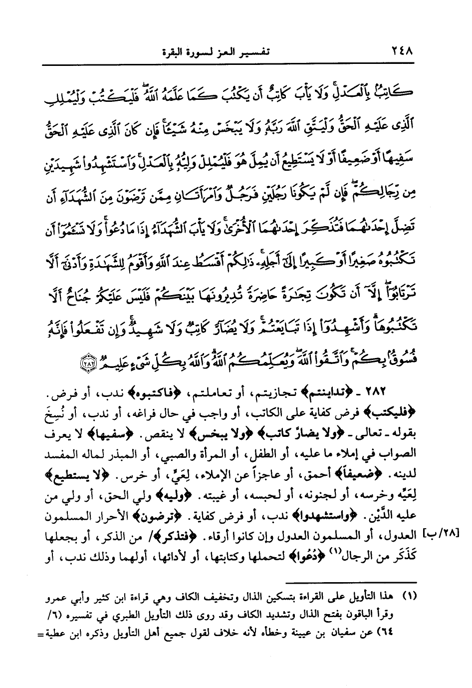 282 - {تَدَايَنتُم} تجازيتم، أو تعاملتم، {فاكْتُبُوهُ} ندب، أو فرض. {فَلْيَكْتُبْ} فرض كفاية على الكاتب، أو واجب في حال فراغه، أو ندب، أو نُسِخَ بقوله - تعالى - {وَلا يُضَآرَّ كَاتِبٌ} {وَلا يَبْخَسْ) {لا ينقص} (سَفِيهاً} لا يعرف الصواب في إملاء ما عليه، أو الطفل، أو المرأة والصبي، أو المبذر لماله المفسد لدينه. {ضَعِيفاً} أحمق، أو عاجزاً عن الإملاء، لِعَيٍّ، أو خرس. {لايستطيع} لِعَيِّه وخرسه، أو لجنونه، أو لحبسه، أو غيبته. {وَلِيُّهُ} ولي الحق، أو ولي من عليه الدَّيْن. {وَاسْتَشْهِدُواْ} ندب، أو فرض كفاية. {تَرْضَوْنَ} الأحرار المسلمون العدول، أو المسلمون العدول وإن كانوا أرقاء. {فَتُذَكِّرَ} / من الذكر، أو بجعلها كَذَكَر من الرجال {دُعُواْ} لتحملها وكتابتها، أو لأدائها، أولهما وذلك ندب، أو