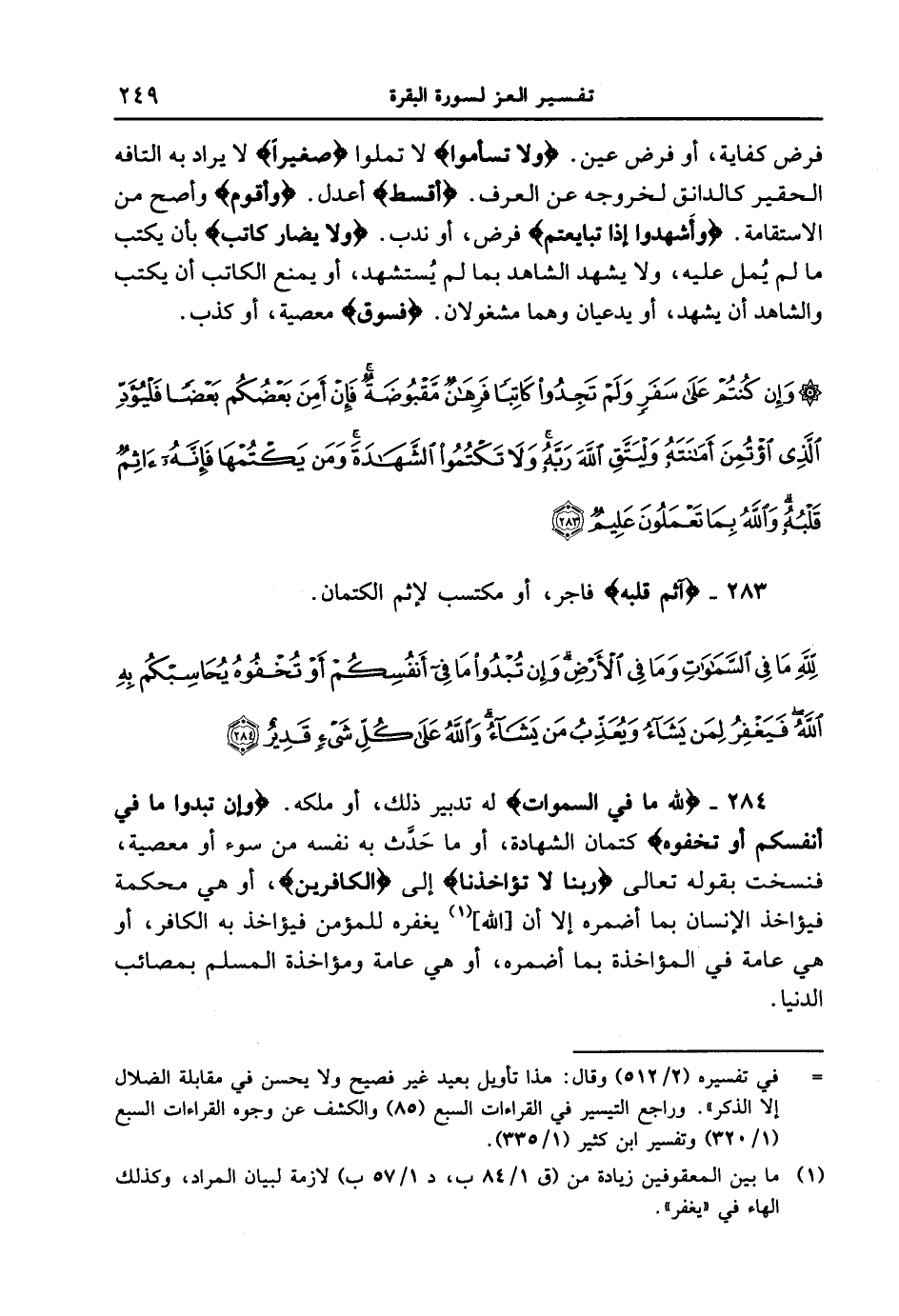 فرض كفاية، أو فرض عين. {ولا تسأموا} لا تملوا {صَغِيراً} لا يراد به التافه الحقير كالدانق لخروجه عن العرف. {أَقْسَطُ} أعدل. {وَأَقْوَمُ} وأصح من الاستقامة. {وَأَشْهِدُواْ إِذَا تَبَايَعْتُمْ} فرض، أو ندب. {وَلا يُضَآرَّ كَاتِبٌ} بأن يكتب ما لم يُمل عليه، ولا يشهد الشاهد بما لم يُستشهد، أو يمنع الكاتب أن يكتب والشاهد أن يشهد، أو يدعيان وهما مشغولان. {فسوق} معصية، أو كذب. {وإن كنتم على سفر ولم تجدوا كاتباً فرهان مقبوضة فإن أمن بعضكم بعضاً فليؤد الذي اؤتمن أمانته وليتق الله ربه ولا تكتموا الشهادة ومن يكتمها فإنه ءاثم قلبه والله بما تعملون عليم (283) }