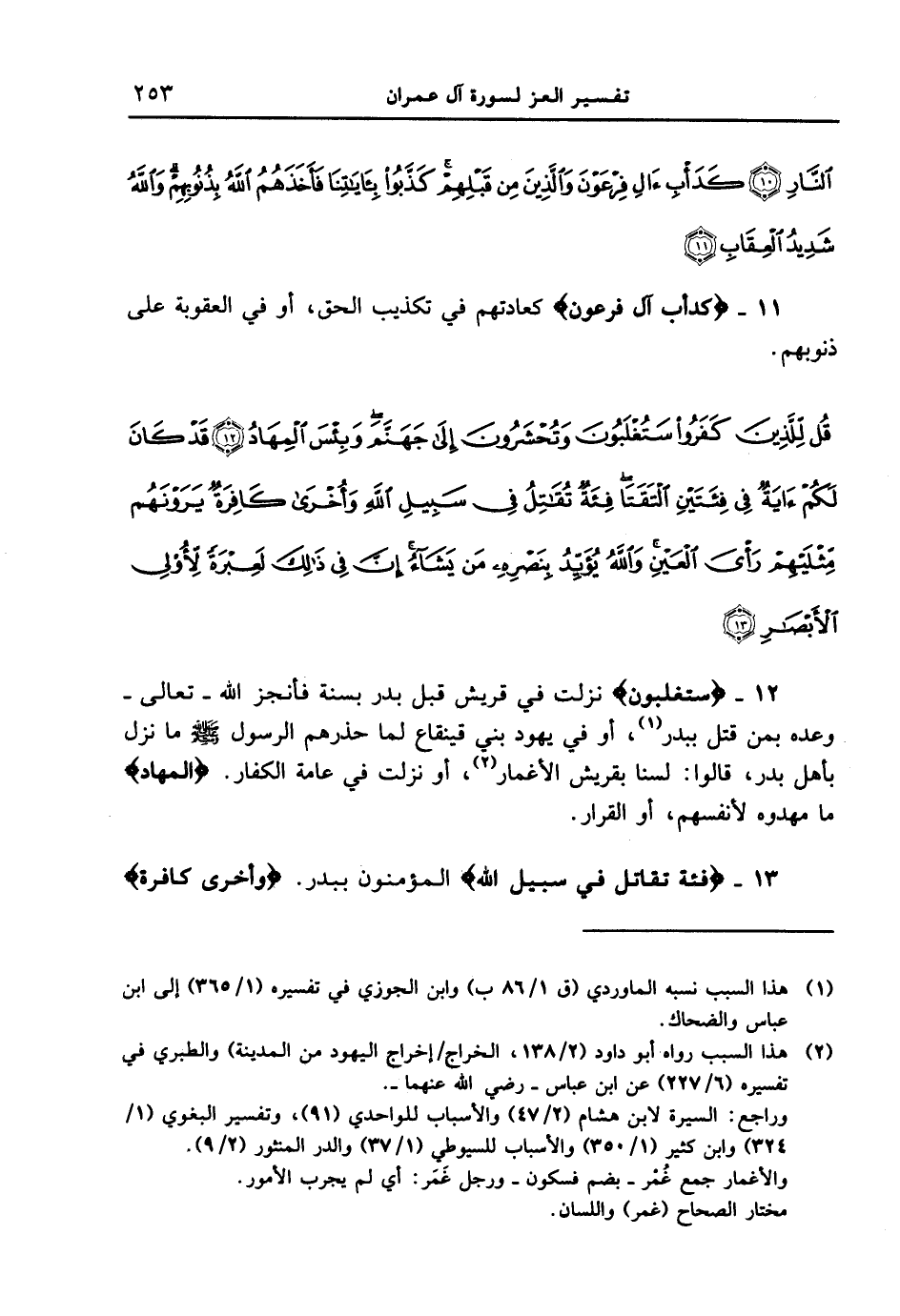 12 - {سَتُغْلَبُونَ} نزلت في قريش قبل بدر بسنة فأنجز الله - تعالى - وعده بمن قُتل ببدر، أو في يهود بني قينقاع لما حذرهم الرسول صلى الله عليه وسلم ما نزل بأهل بدر، قالوا: لسنا بقريش الأغمار، أو نزلت في عامة الكفار. {الْمِهَادُ} ما مهدوه لأنفسهم، أو القرار.