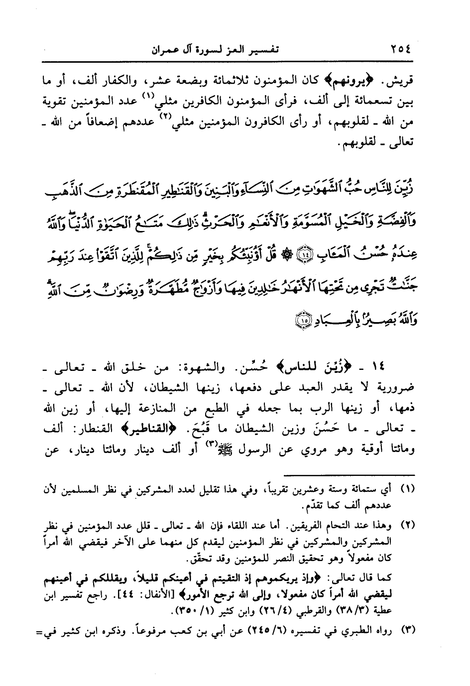 14 - {زُيِّنَ لِلنَّاسِ} حُسِّن. والشهوة: من خلق الله - تعالى - ضرورية لا يقدر العبد على دفعها، زينها الشيطان، لأن الله - تعالى - ذمها، أو زينها الرب بما جعله في الطبع من المنازعة إليها، أو زين الله - تعالى - ما حسن وزين الشيطان ما قبح. {القناطير} القنطار: ألف ومائتا أوقية وهو مروي عن الرسول صلى الله عليه وسلم أو الف دينار ومائتا دينار،