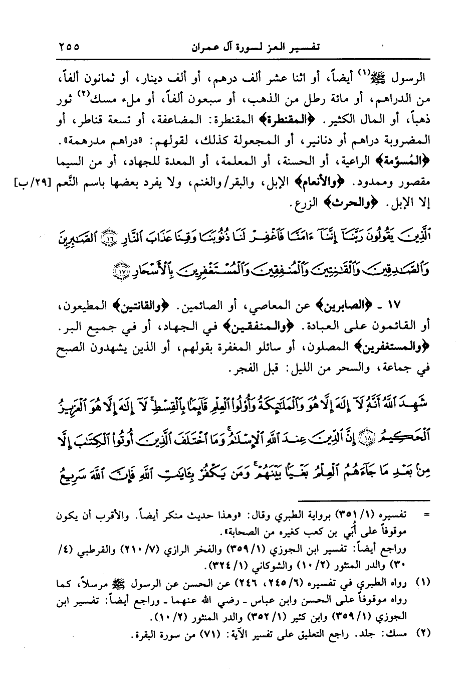 17 - {الصَّابِرِينَ} عن المعاصي، أو الصائمين. {وَالْقَانِتِينَ} المطيعون، أو القائمون على العبادة. {والمنفقين} في الجهاد، أو في جميع البر. {والمستغفرين} المصلون، أو سائلو المغفرة بقولهم، أو الذين يشهدون الصبح في جماعة، والسحر من الليل: قبل الفجر. {شَهِدَ الله أنه لآ إله إلاّ هو والملائكة وأولوا العلم قآئماً بالقسط لآ إله إلاّ هو العزيز الحكيم (18) إن الدين عند الله الإسلام وما اختلف الذين أوتوا الكتاب إلاّ من بعد ما جآءهم العلم بغيا بينهم ومن يكفر بئايات الله فإن الله سريع