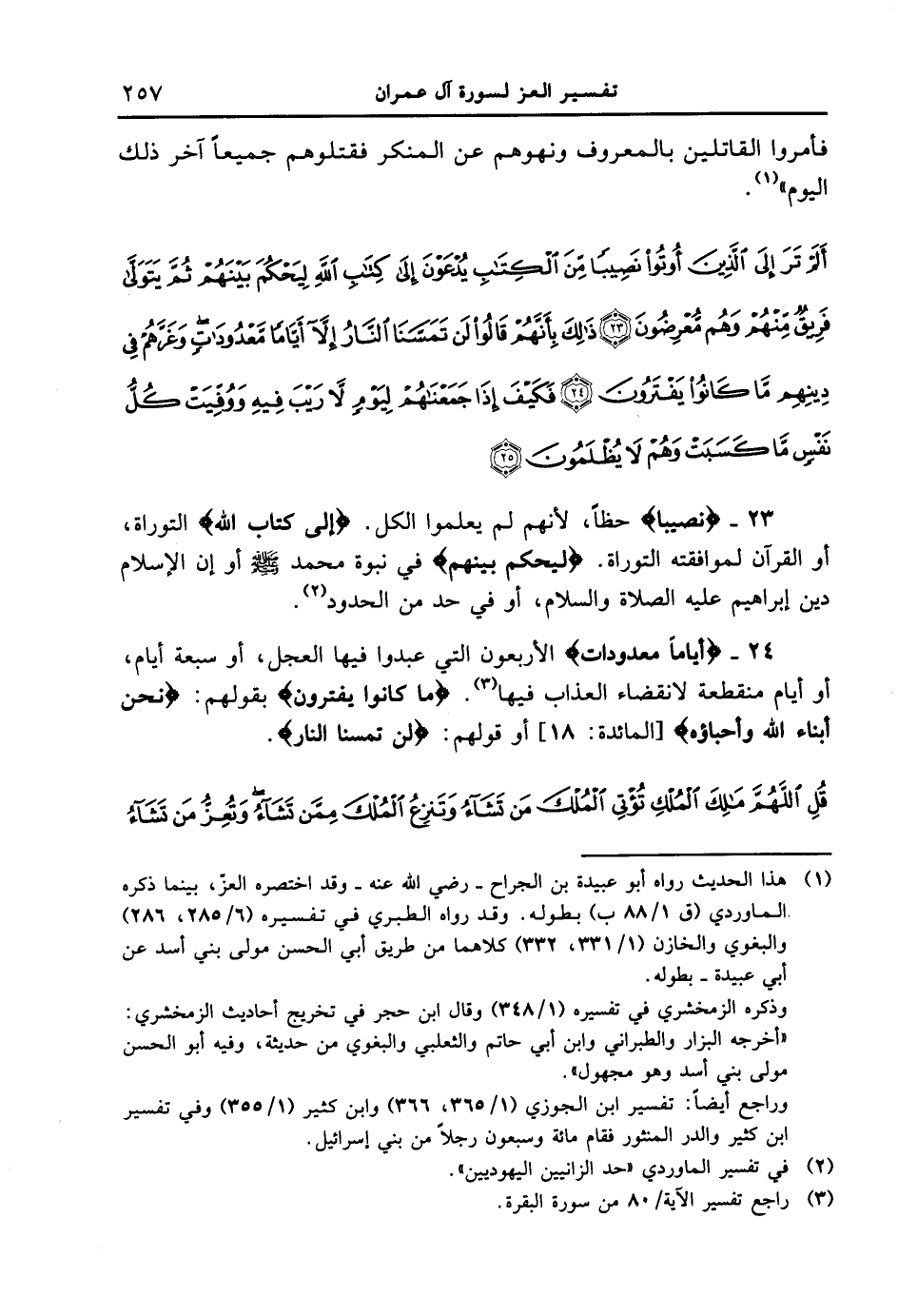 فأمروا القاتلين بالمعروف ونهوهم عن المنكر فقتلوهم جميعاً آخر ذلك اليوم. {ألم تر إلى الذين أوتوا نصيباً من الكتاب يدعون إلى كتاب الله ليحكم بينهم ثم يتولى فريق منهم وهم معرضون (23) ذلك بأنهم قالوا لن تمسنا النار إلآ أياماً معدودات وغرهم في دينهم ما كانوا يفترون (24) فكيف إذا جمعناهم ليوم لا ريب فيه ووفّيت كل نفس ما كسبت وهم لا يظلمون (25) }