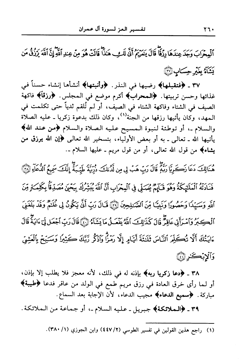 37 - {فَتَقَبَّلَهَا} رضيها في النذر. {وَأَنبَتَهَا} أنشأها إنشاء حسناً في غذائها وحسن تربيتها. {الْمِحْرَابَ} أكرم موضع في المجلس. {رِزْقًا} فاكهة الصيف في الشتاء وفاكهة الشتاء في الصيف، أو لم تُلقم ثدياً حتى تكلمت في المهد، وكان يأتيها رزقها من الجنة، وكان ذلك بدعوة زكريا - عليه الصلاة والسلام -. أو توطئة لنبوة المسيح عليه الصلاة والسلام {مِنْ عِندِ اللَّهِ} يأتيها الله - تعالى - به أو بعض الأولياء، بتسخير الله تعالى {إِنَّ اللَّهَ يَرْزُقُ مَن يَشَآءُ} من قول الله تعالى، أو من قول مريم - عليها السلام -. {هنالك دعا زكريا ربه قال رب هب لي من لدنك ذرية طيبة إنك سميع الدعآء (38) فنادته الملآئكة وهو قائم يصلي في المحراب أن الله يبشرك بيحيى مصدقاً بكلمة من الله وسيداً وحصوراً ونبياً من الصالحين (39) قال رب أنى يكون لي غلام وقد بلغني الكبر وامرأتي عاقر قال كذلك الله يفعل ما يشآء (40) قال رب اجعل لي ءاية قال ءايتك ألا تكلم الناس ثلاثة أيام إلا رمزا واذكر ربك كثيرا وسبح بالعشي والإبكار (41) }