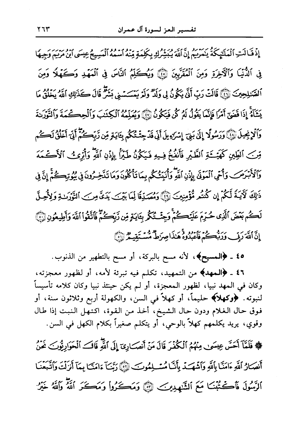 {إذ قالت الملائكة يا مريم إن الله يبشرك بكلمة منه اسمه المسيح عيسى ابن مريم وجيهاً في الدنيا والآخرة ومن المقّربين (45) ويكلم الناس في المهد وكهلاً ومن الصالحين (46) قالت رب أنى يكون لي ولد ولم يمسسني بشر قال كذلك الله يخلق ما يشآء إذا قضى أمراً فإنما يقول له كن فيكون (47) ويعلمه الكتاب والحكمة والتوراة والإنجيل (48) ورسولاً إلى بني إسرآءيل أني قد جئتكم بئاية من ربكم أني أخلق لكم من الطين كهيئة الطير فأنفخ فيه فيكون طيراً بإذن الله وأبرىء الأكمه والأبرص وأحيي الموتى بإذن الله وأنبئكم بما تأكلون وما تدخرون في بيوتكم إن في ذلك لآية لكم إن كنتم مؤمنين (49) ومصدقاً لما بين يدي من التوراة ولأحل لكم بعض الذي حرم عليكم وجئتكم بئاية من ربكم فاتقوا الله وأطيعون (50) إن الله ربي وربكم فاعبدوه هذا صراط مستقيم (51) }