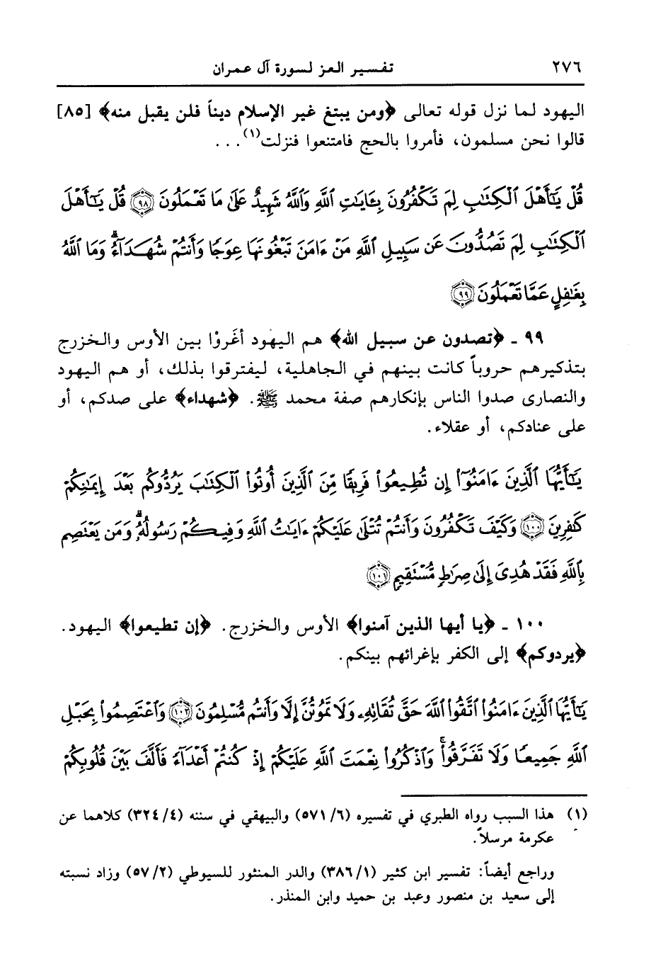 اليهود لما نزل قوله تعالى {وَمَن يَبْتَغِ غير الإسلام دينا فلن يقبل منه} [85] قالوا نحن مسلمون، فأُمروا بالحج فامتنعوا فنزلت ... . {قل يآ أهل الكتاب لم تكفرون بآيات الله والله شهيد على ما تعملون (98) قل يآ أهل الكتاب لم تصدون عن سبيل الله من آمن تبغونها عوجاً وأنتم شهدآء وما الله بغافل عما تعملون (99) }