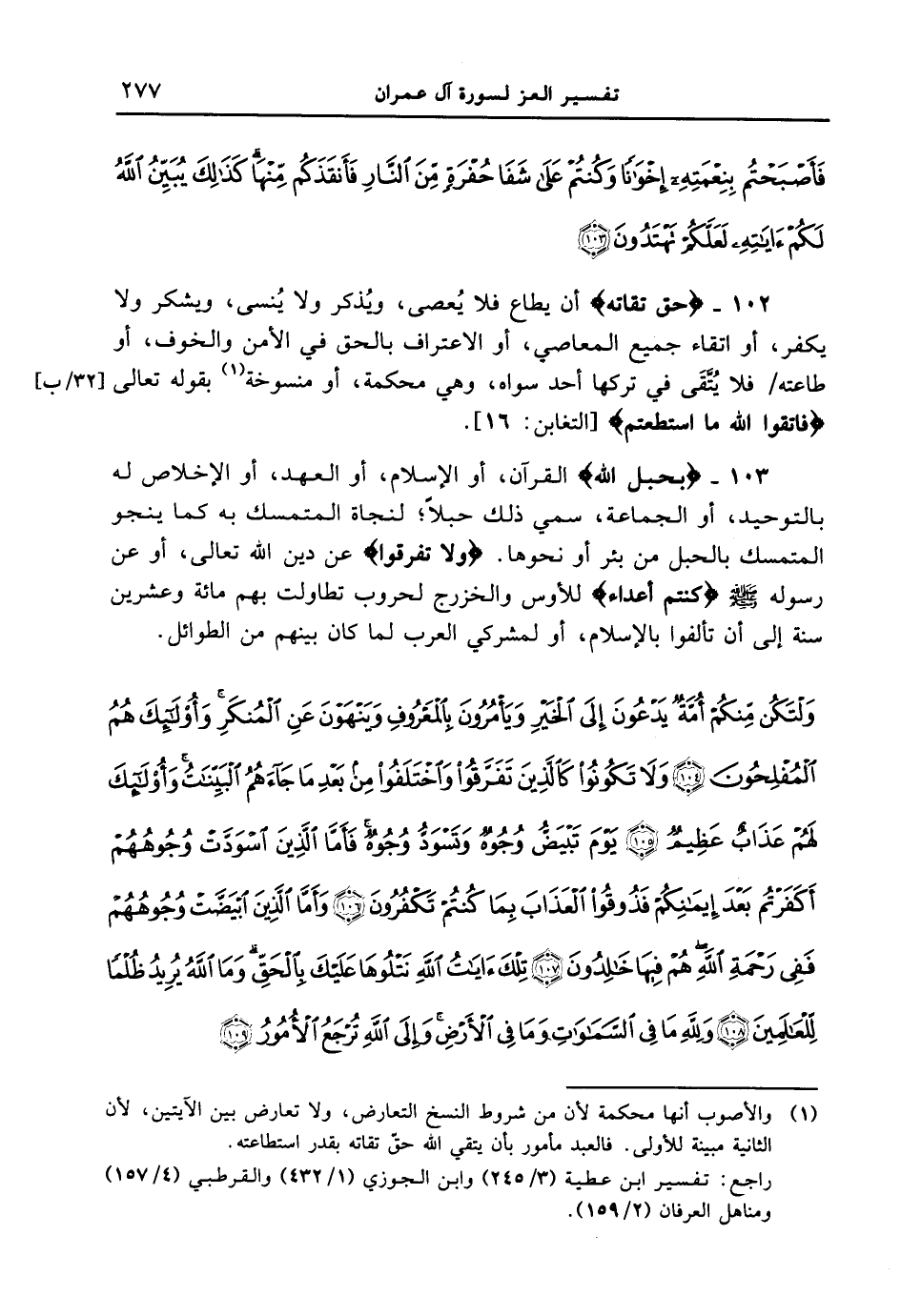 103 - {بِحَبْلِ اللَّهِ} القرآن، أو الإسلام، أو العهد، أو الإخلاص له بالتوحيد، أو الجماعة، سمي ذلك حبلاً؛ لنجاة المتمسك به كما ينجو المتمسك بالحبل من بئر أو نحوها. {وَلا تَفَرَّقُواْ} عن دين الله تعالى، أو عن رسوله صلى الله عليه وسلم {كُنتُمْ أَعْدَآءً} للأوس والخزرج لحروب تطاولت بهم مائة وعشرين سنة إلى أن تآلفوا بالإسلام، أو لمشركي العرب لما كان بينهم من الطوائل. {ولتكن منكم أمة يدعون إلى الخير ويأمرون بالمعروف وينهون عن المنكر وأولئك هم المفلحون (104) ولا تكونوا كالذين تفرقوا واختلفوا من بعد ما جآءهم البينات وأولئك لهم عذاب عظيم (105) يوم تبيض وجوه وتسود وجوه فأما الذين اسودت وجوههم أكفرتم بعد إيمانكم فذوقوا العذاب بما كنتم تكفرون (106) وأما الذين ابيضت وجوههم ففي رحمة الله هم فيها خالدون (107) تلك ءايات الله نتلوها عليك بالحق وما الله يريد ظلما للعالمين (108) ولله ما في السماوات وما في الأرض وإلى الله ترجع الأمور (109)