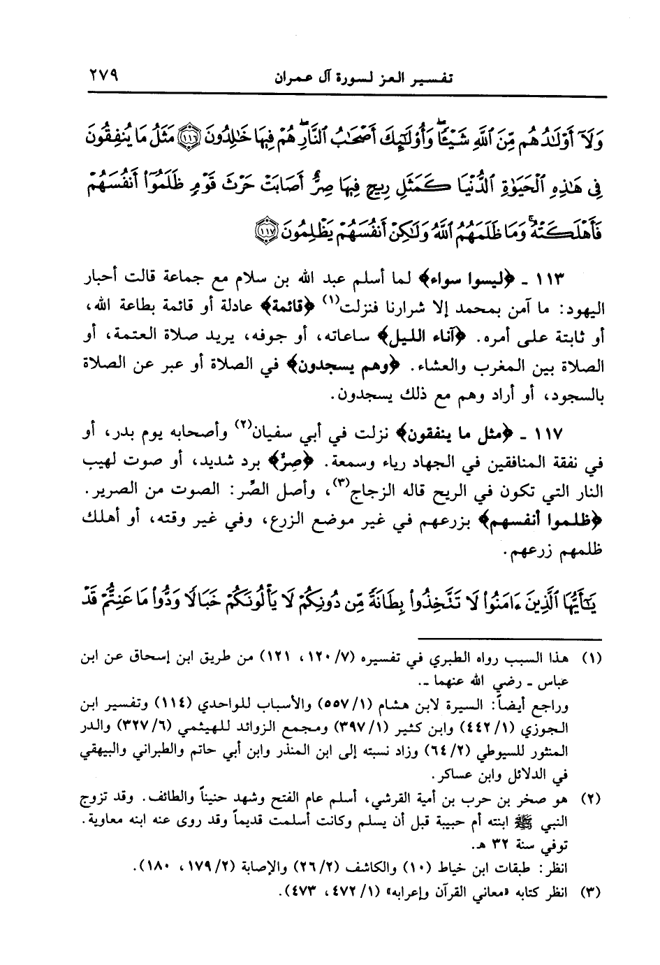 113 - {لَيْسُواْ سَوَآءً} لما أسلم عبد الله بن سلام مع جماعة قالت أحبار اليهود: ما آمن بمحمد إلا شرارنا فنزلت {قَآئِمَةٌ} عادلة أو قائمة بطاعة الله، أو ثابتة على أمره. {آناء الليل} ساعاته، أو جوفه، يريد صلاة العتمة، أو الصلاة بين المغرب والعشاء. {وَهُمْ يَسْجُدُونَ} في الصلاة أو عبّر عن الصلاة بالسجود، أو أراد وهم مع ذلك يسجدون.