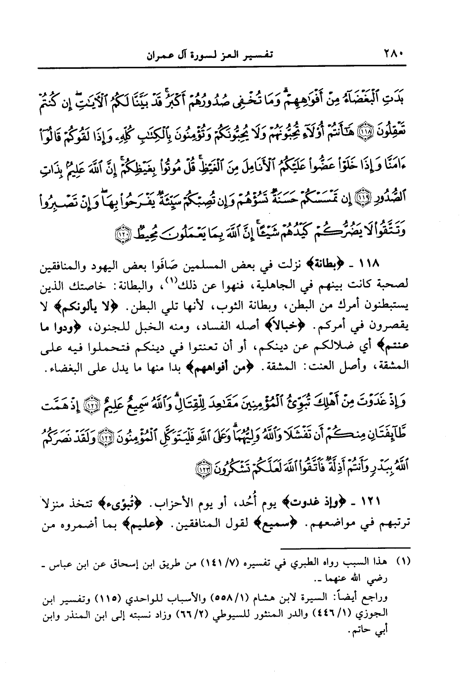 118 - {بِطَانَةً} نزلت في بعض المسلمين صَافَوا بعض اليهود والمنافقين لصحبة كانت بينهم في الجاهلية، فنهوا عن ذلك، والبطانة: خاصتك الذين يستبطنون أمرك من البطن، وبطانة الثوب، لأنها تلي البطن. {لا يَأْلُونَكُمْ} لا يقصرون في أمركم. {خَبَالاً} أصله الفساد، ومنه الخبل للجنون، {وَدُّواْ مَا عَنِتُّمْ} أي ضلالكم عن دينكم، أو أن تعنتوا في دينكم فتحملوا فيه على المشقة، وأصل العنت: المشقة. {مِنْ أَفْوَاهِهِمْ} بدا منها ما يدل على البغضاء. {وإِذْ غَدَوْتَ من أهلك تبوىء المؤمنين مقاعد للقتال والله سميع عليم (121) إذ همت طآئفتان منكم أن تفشلا والله وليهما وعلى الله فليتوكل المؤمنون (122) ولقد نصركم الله ببدر وأنتم أذلة فاتقوا الله لعلكم تشكرون (123) }